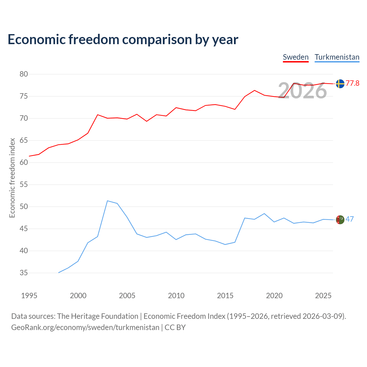 The Economic Freedom Index for Sweden is 77.8, ranking 14/197, compared to 47 for Turkmenistan, ranking 177/197. The chart above displays a comparison of annual changes in economic freedom indexes.