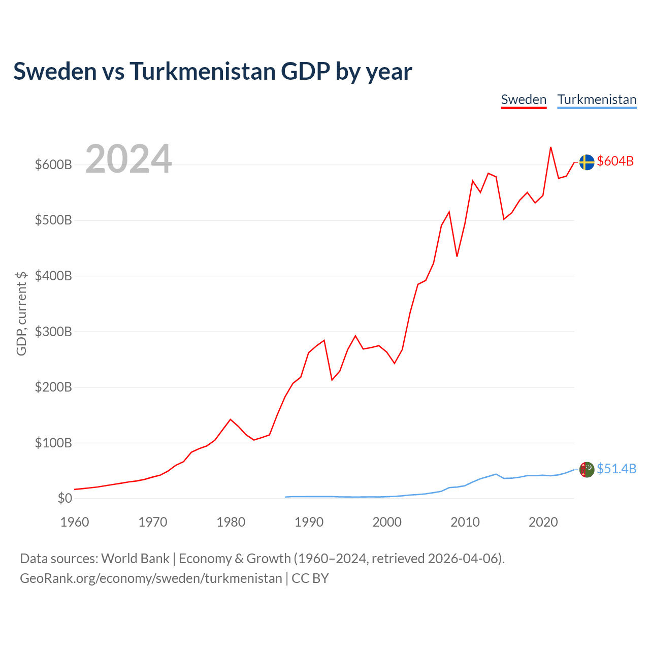 Sweden has a GDP of $604B compared to $51.4B for Turkmenistan, ranking 26/197 and 92/197 by economy size, respectively.
