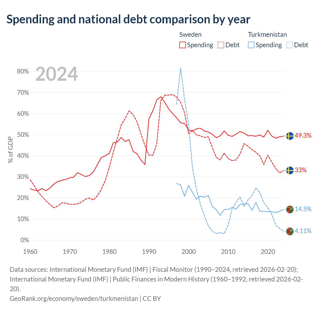 Sweden has $199B in government debt (33% of GDP), compared to $2.11B (4.11% of GDP) in Turkmenistan.