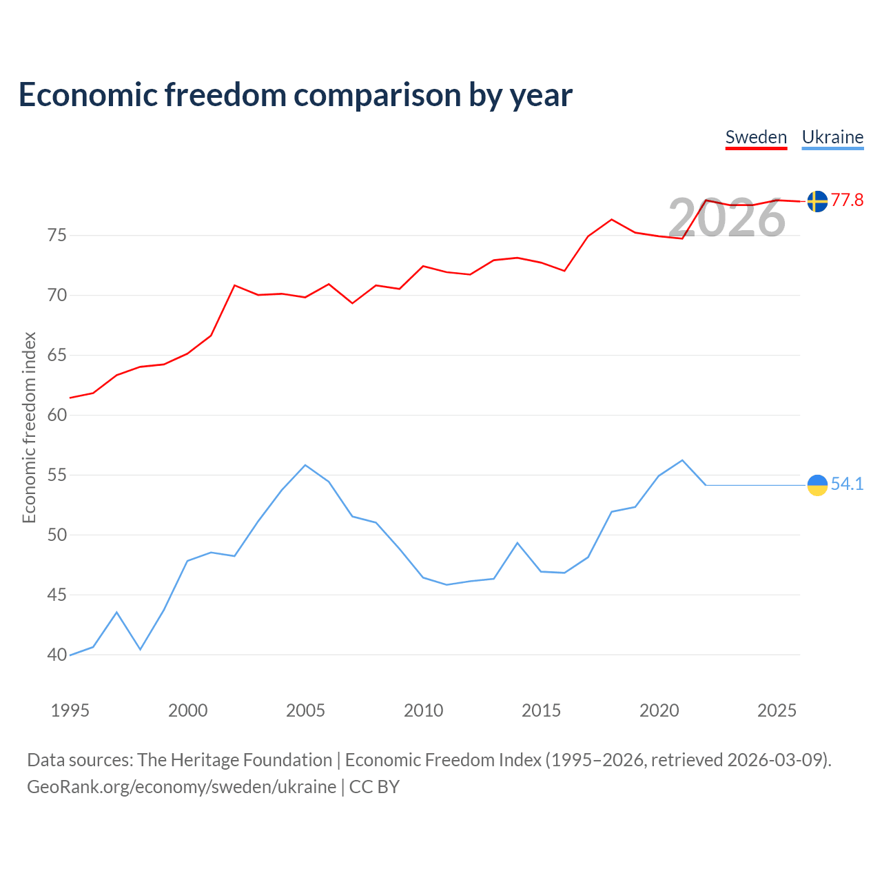 The Economic Freedom Index for Sweden is 77.8, ranking 14/197, compared to 54.1 for Ukraine, ranking 135/197. The chart above displays a comparison of annual changes in economic freedom indexes.