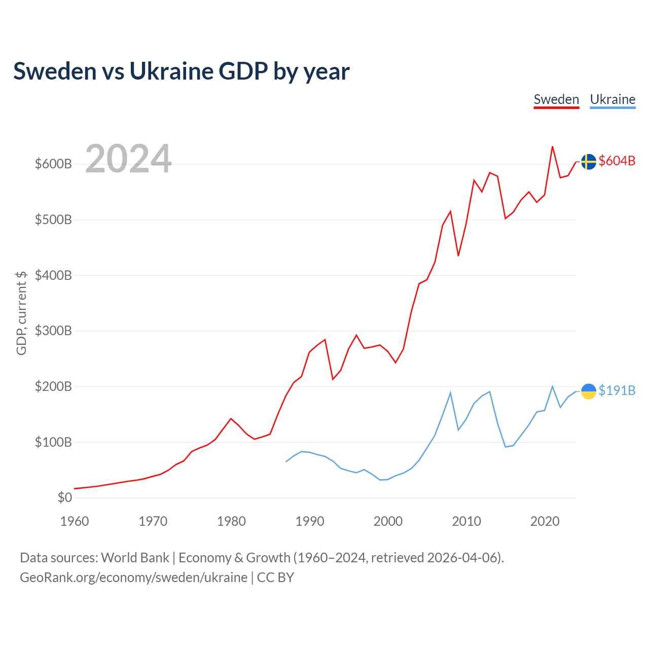 Sweden has a GDP of $604B compared to $191B for Ukraine, ranking 26/197 and 57/197 by economy size, respectively.