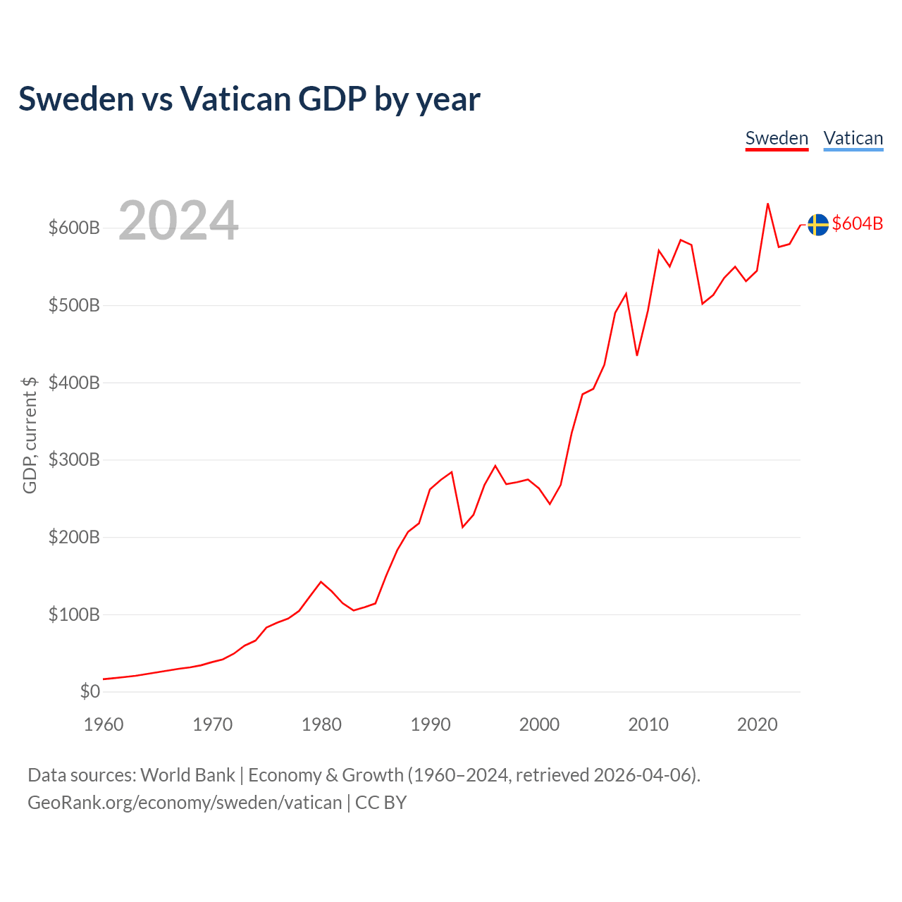 Sweden has a GDP of $604B compared to $19.8M for the Vatican, ranking 26/197 and 197/197 by economy size, respectively.