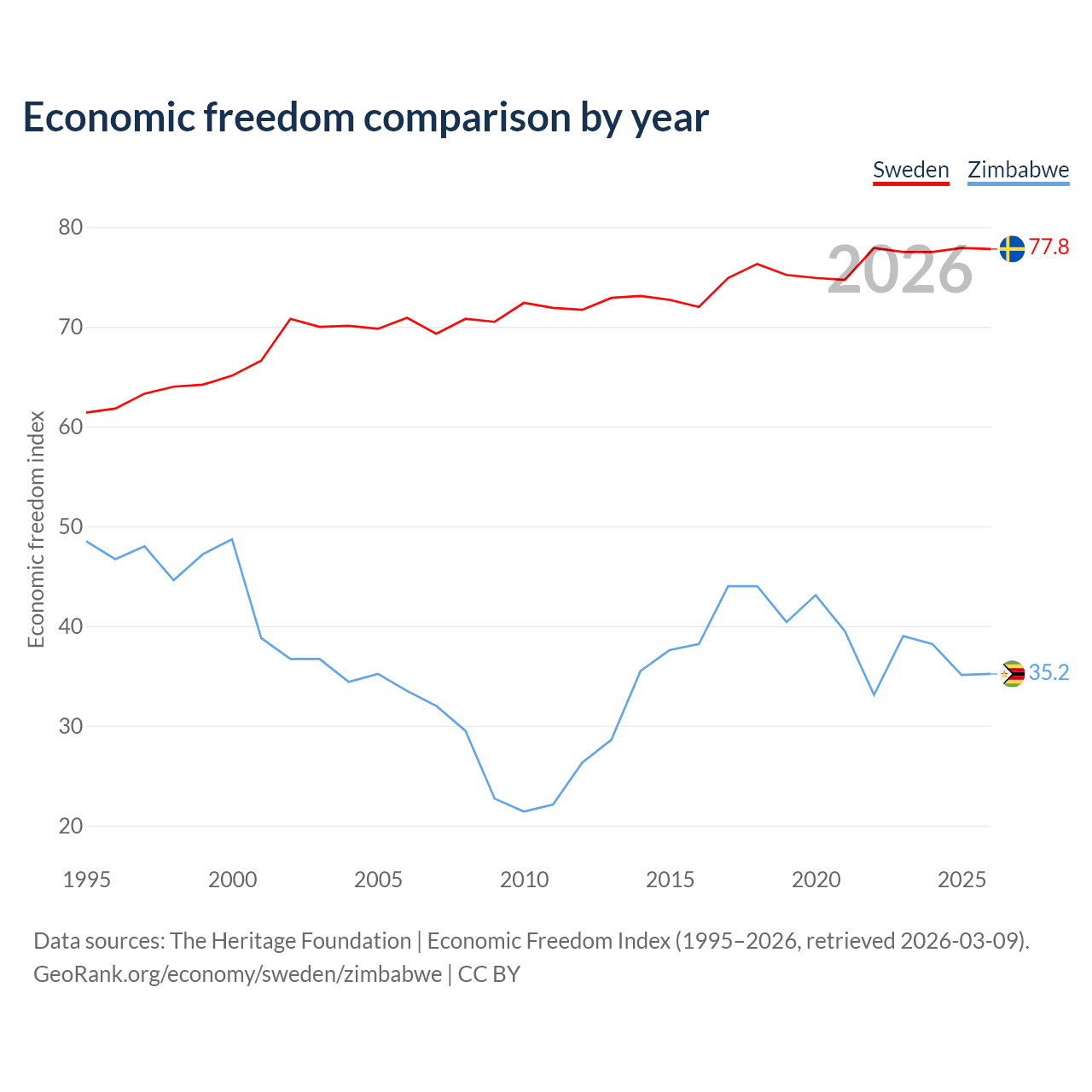 The Economic Freedom Index for Sweden is 77.8, ranking 14/197, compared to 35.2 for Zimbabwe, ranking 190/197. The chart above displays a comparison of annual changes in economic freedom indexes.