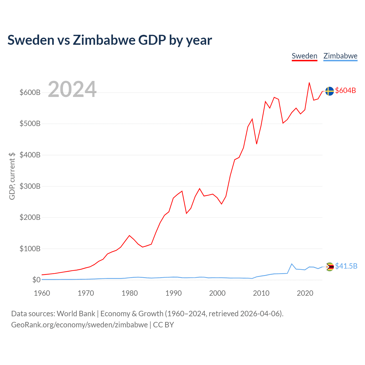 Sweden has a GDP of $604B compared to $41.5B for Zimbabwe, ranking 26/197 and 102/197 by economy size, respectively.