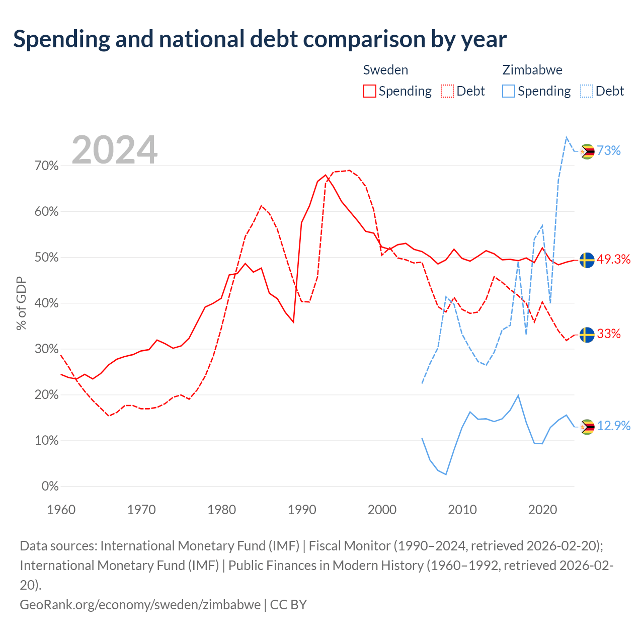 Sweden has $199B in government debt (33% of GDP), compared to $30.3B (73% of GDP) in Zimbabwe.