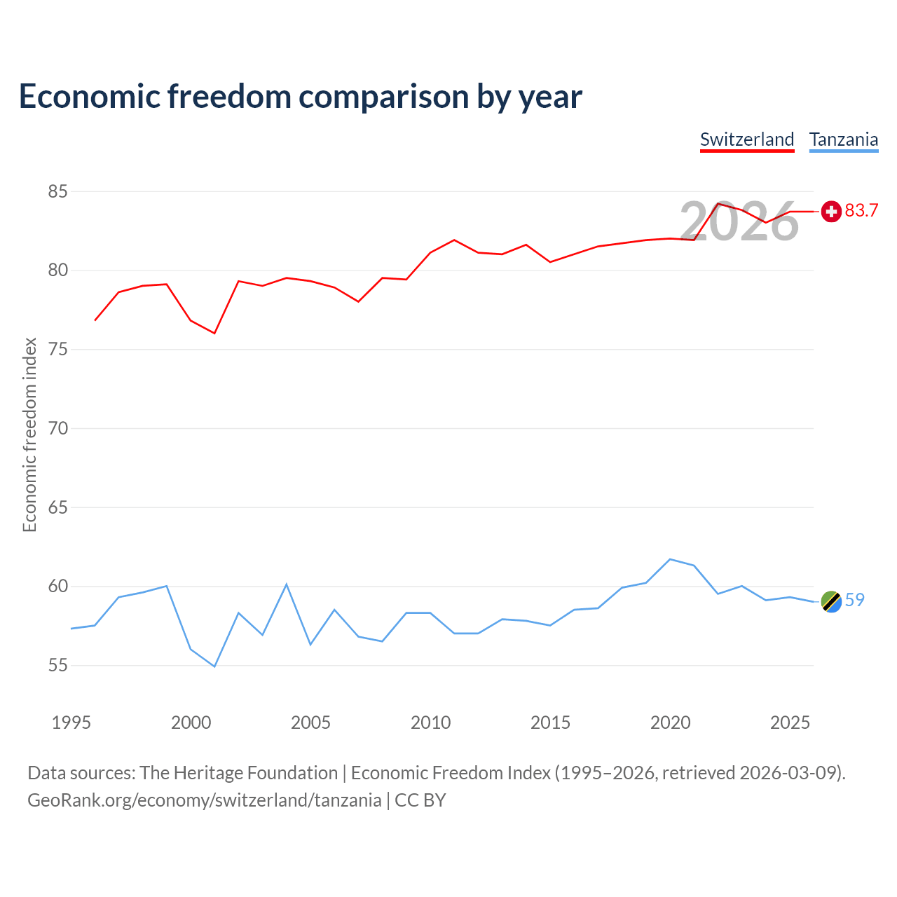 The Economic Freedom Index for Switzerland is 83.7, ranking 2/197, compared to 59 for Tanzania, ranking 106/197. The chart above displays a comparison of annual changes in economic freedom indexes.