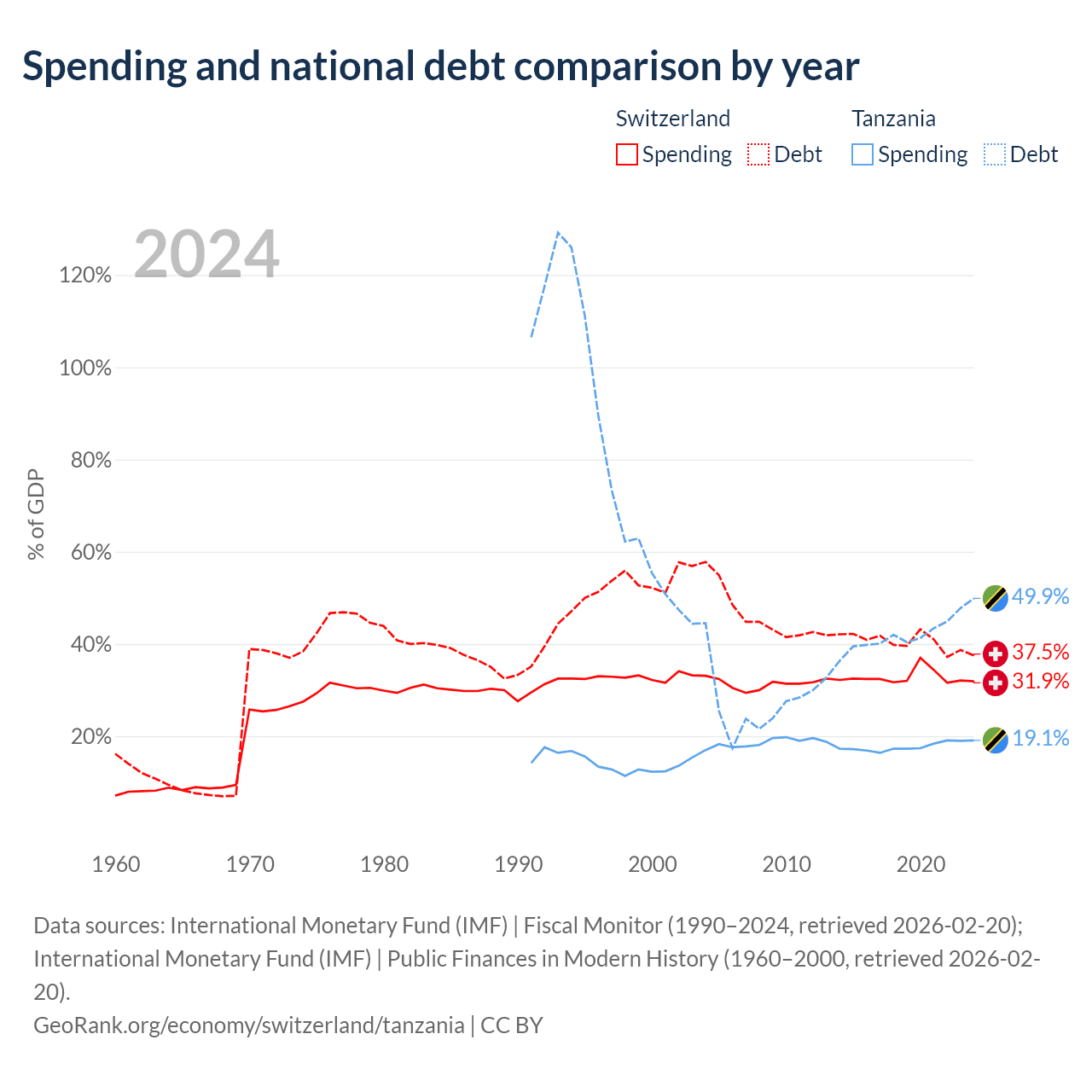 Switzerland has $351B in government debt (37.5% of GDP), compared to $39.3B (49.9% of GDP) in Tanzania.