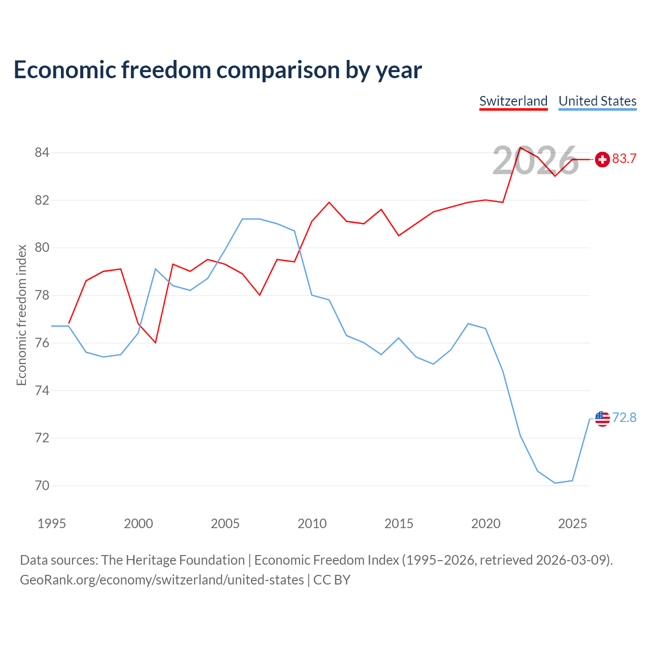 Data sources: The Heritage Foundation | Economic Freedom Index (1995–2026, retrieved 2026-03-09).