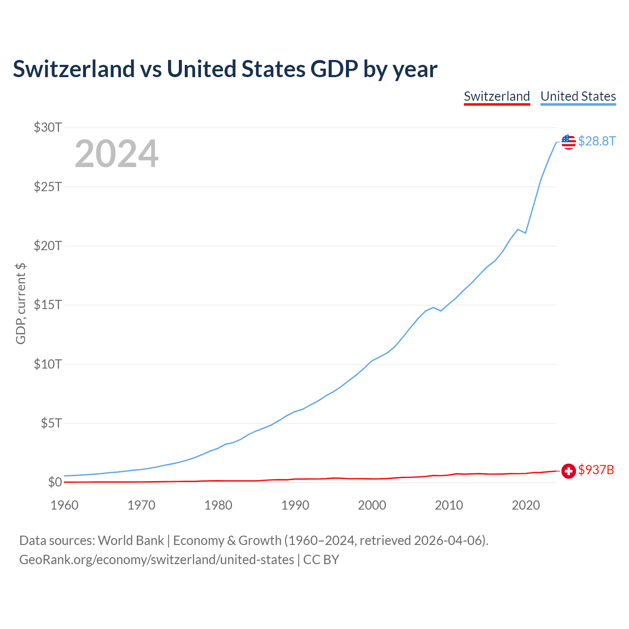 Switzerland has a GDP of $937B compared to $28.8T for the United States, ranking 20/197 and 1/197 by economy size, respectively.