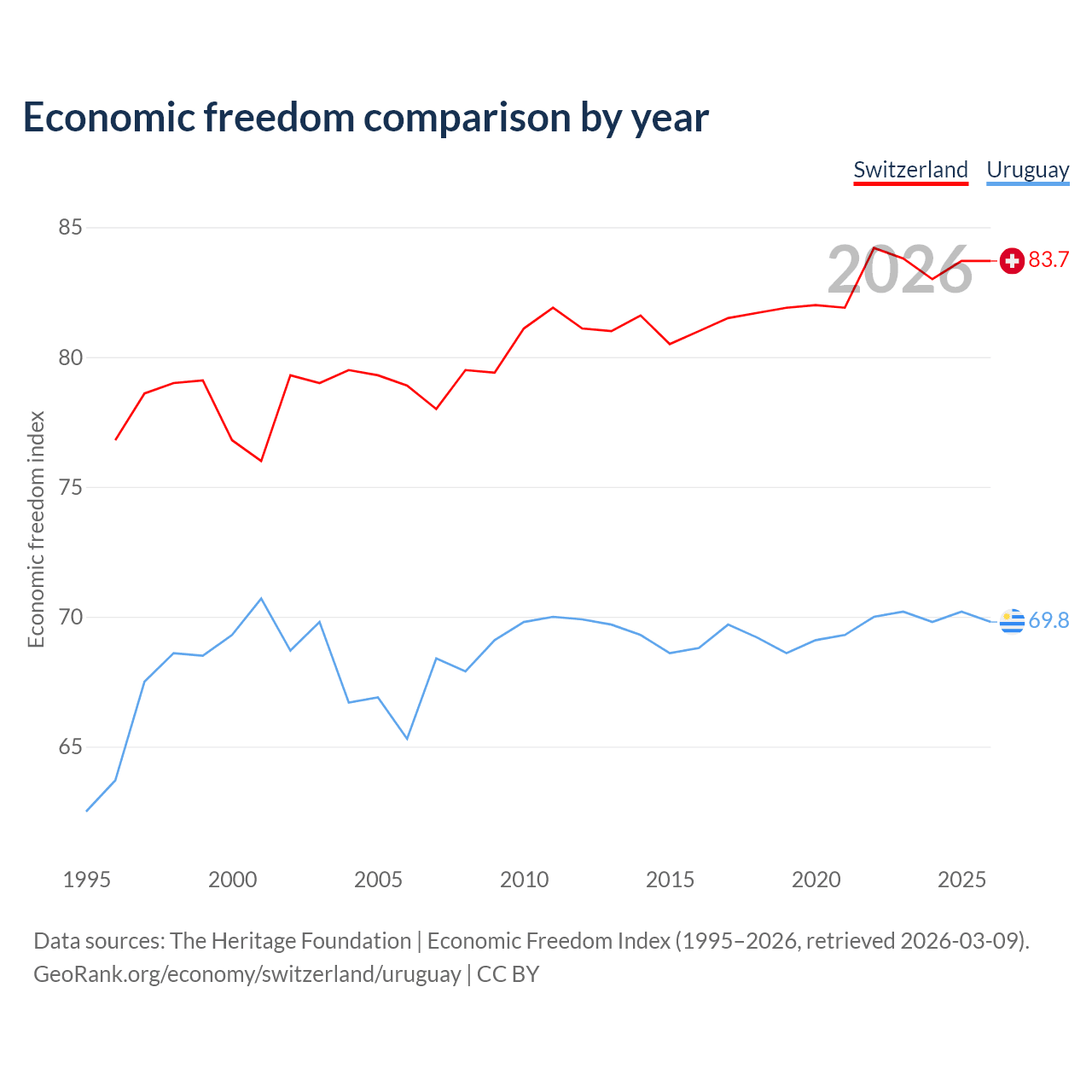 The Economic Freedom Index for Switzerland is 83.7, ranking 2/197, compared to 69.8 for Uruguay, ranking 39/197. The chart above displays a comparison of annual changes in economic freedom indexes.