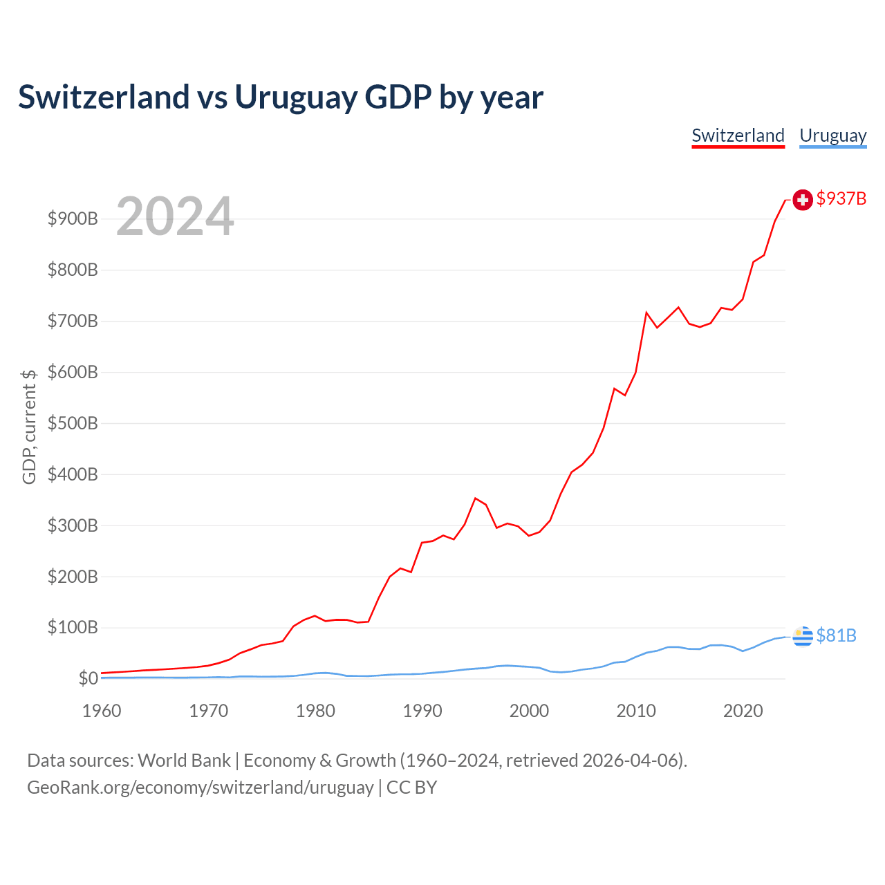 Switzerland has a GDP of $937B compared to $81B for Uruguay, ranking 20/197 and 81/197 by economy size, respectively.