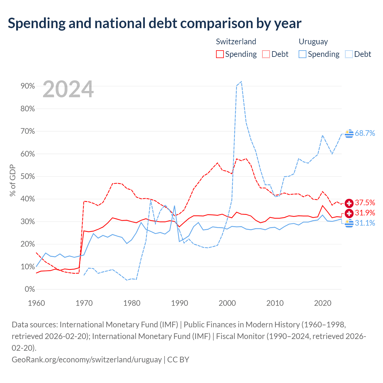 Switzerland has $351B in government debt (37.5% of GDP), compared to $55.6B (68.7% of GDP) in Uruguay.
