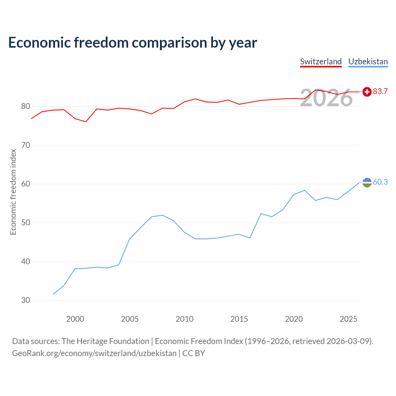 The Economic Freedom Index for Switzerland is 83.7, ranking 2/197, compared to 60.3 for Uzbekistan, ranking 94/197. The chart above displays a comparison of annual changes in economic freedom indexes.