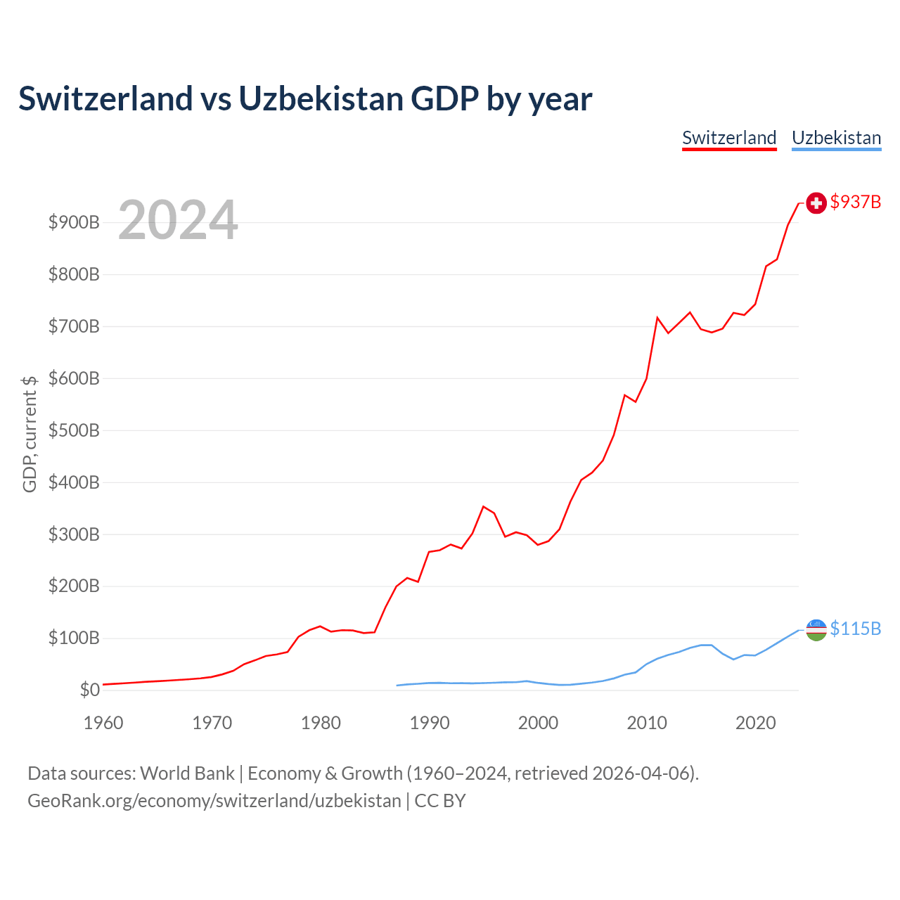 Switzerland has a GDP of $937B compared to $115B for Uzbekistan, ranking 20/197 and 66/197 by economy size, respectively.