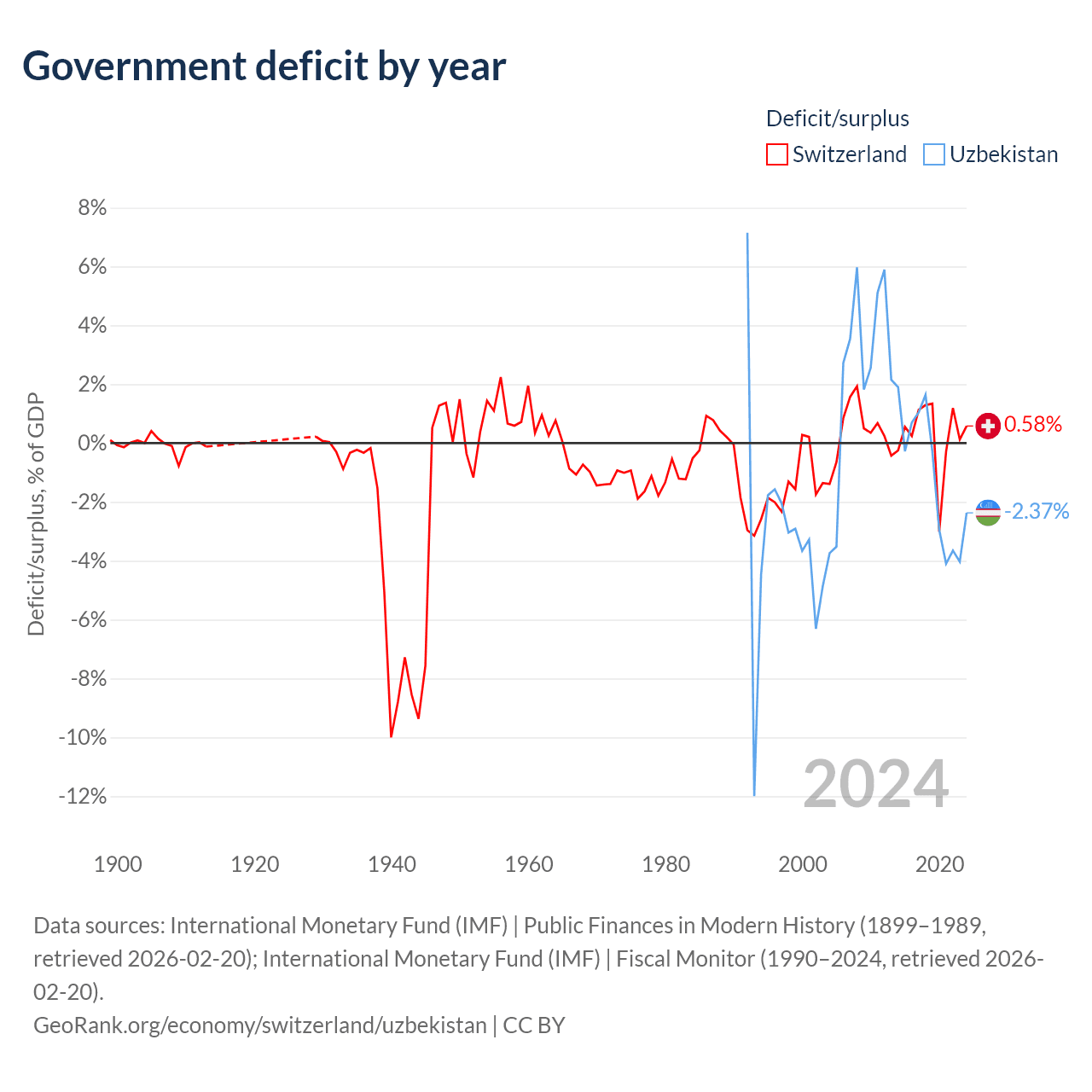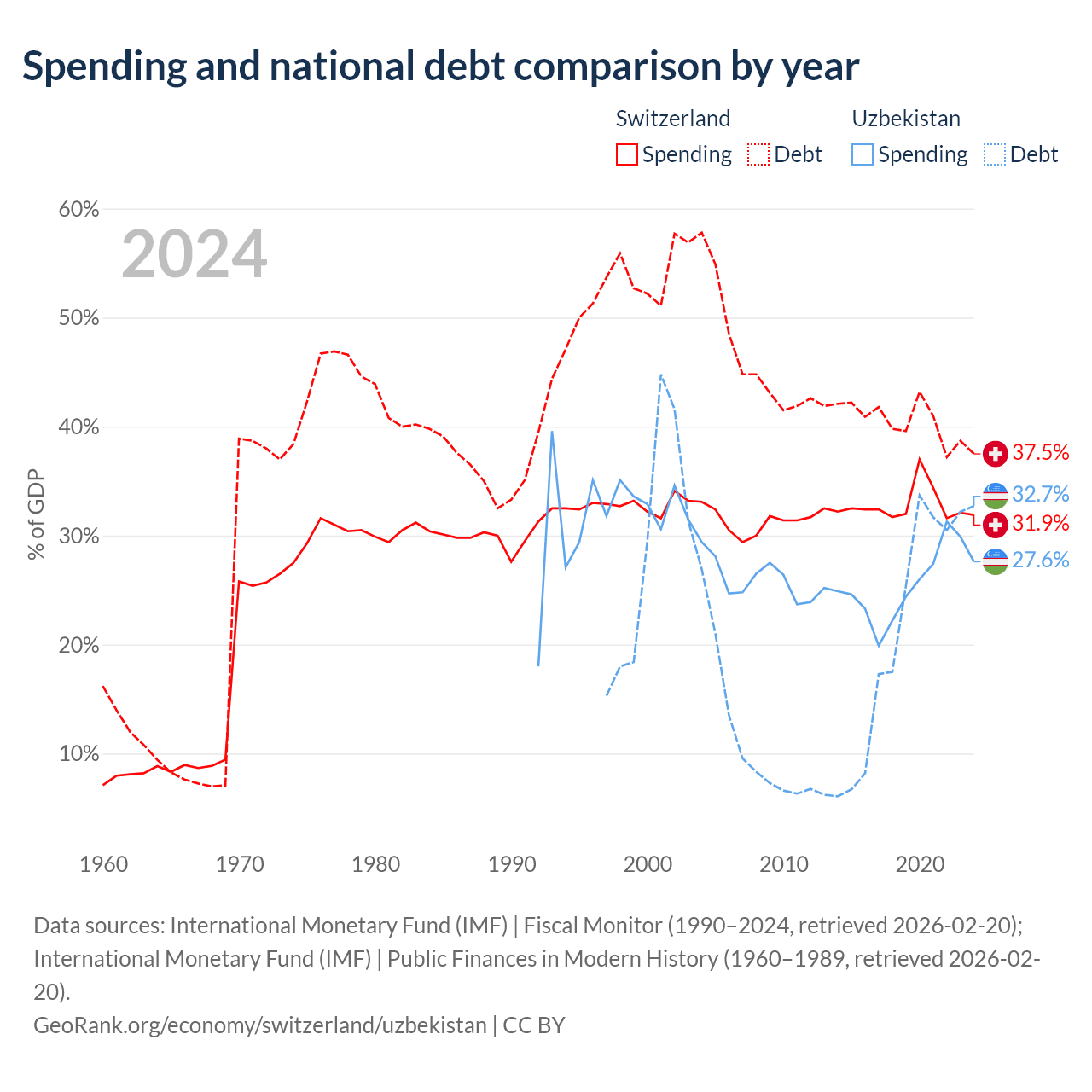 Switzerland has $351B in government debt (37.5% of GDP), compared to $37.5B (32.7% of GDP) in Uzbekistan.