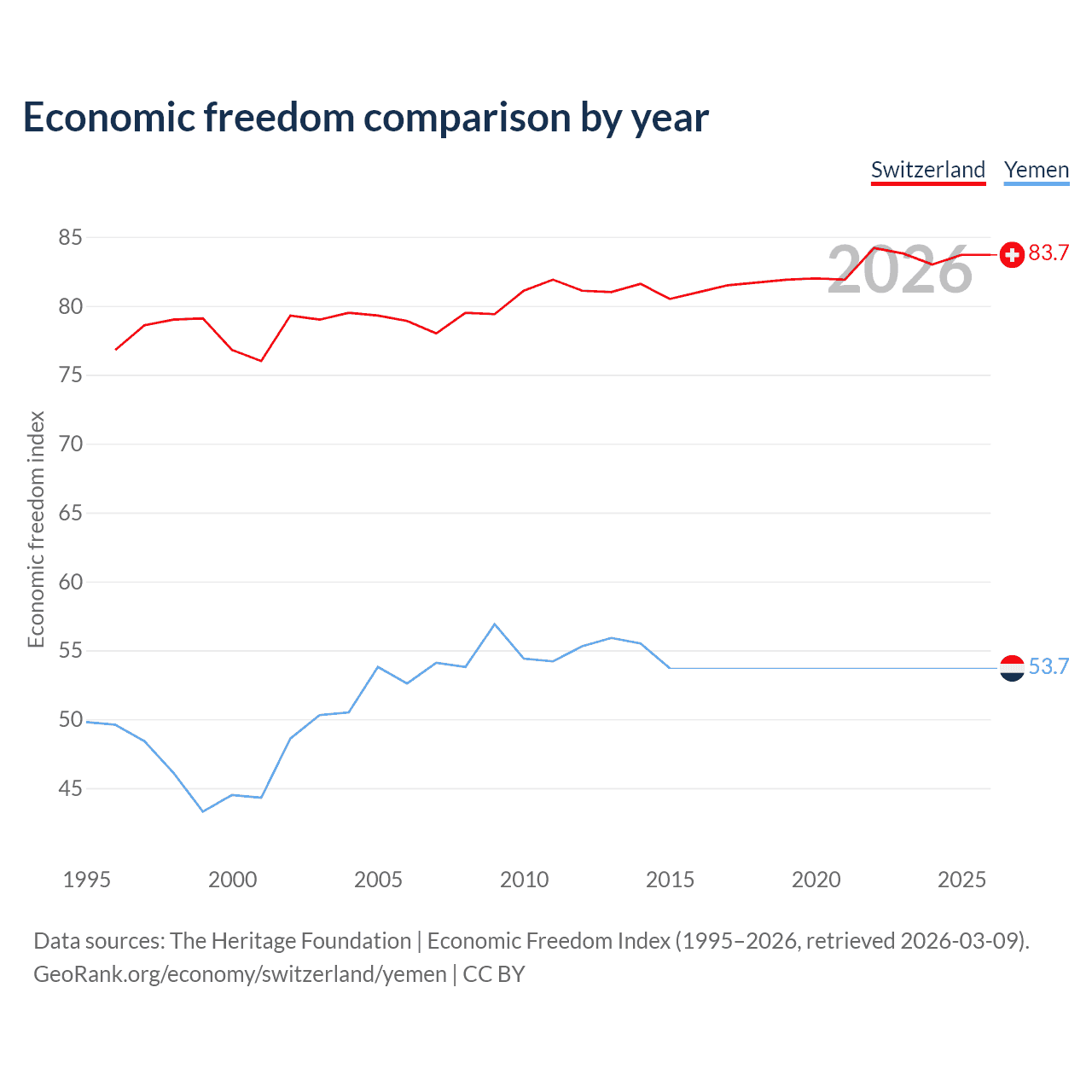 The Economic Freedom Index for Switzerland is 83.7, ranking 2/197, compared to 53.7 for Yemen, ranking 138/197. The chart above displays a comparison of annual changes in economic freedom indexes.