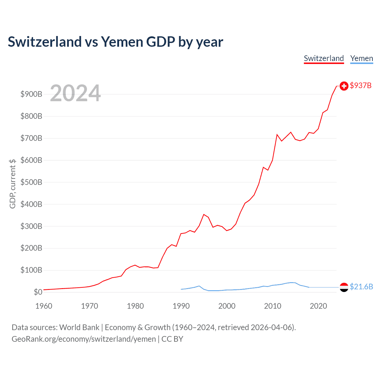Switzerland has a GDP of $937B compared to $21.6B for Yemen, ranking 20/197 and 125/197 by economy size, respectively.