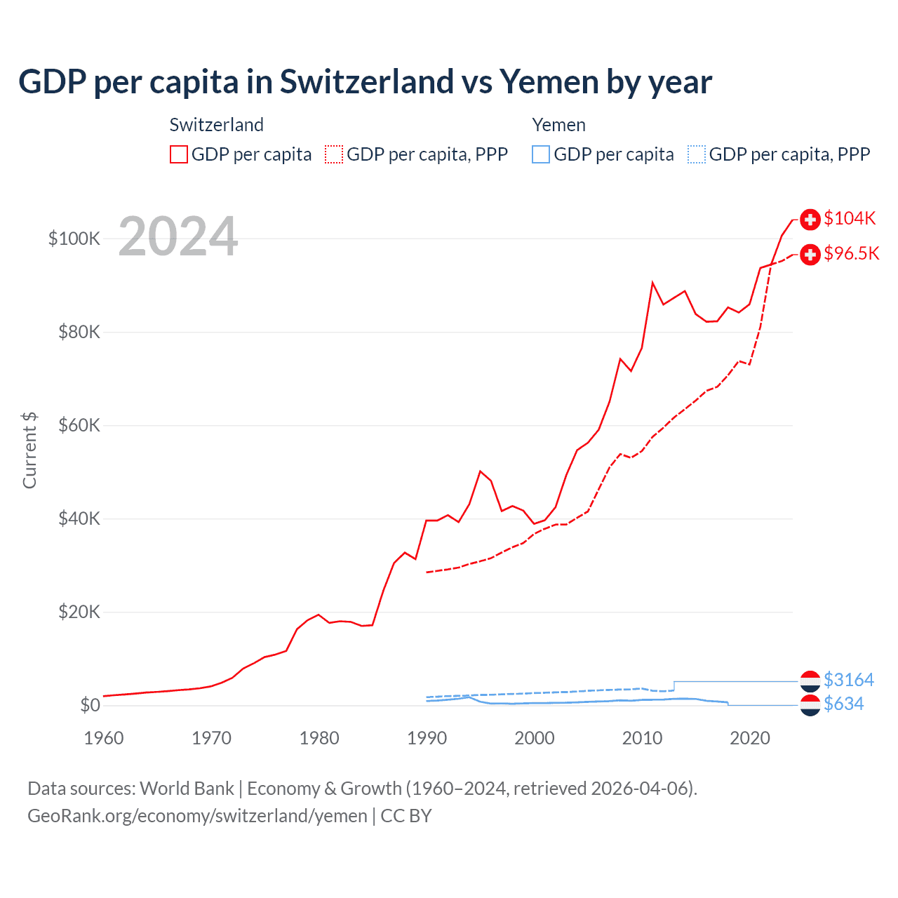 GDP per capita in Switzerland vs Yemen by year