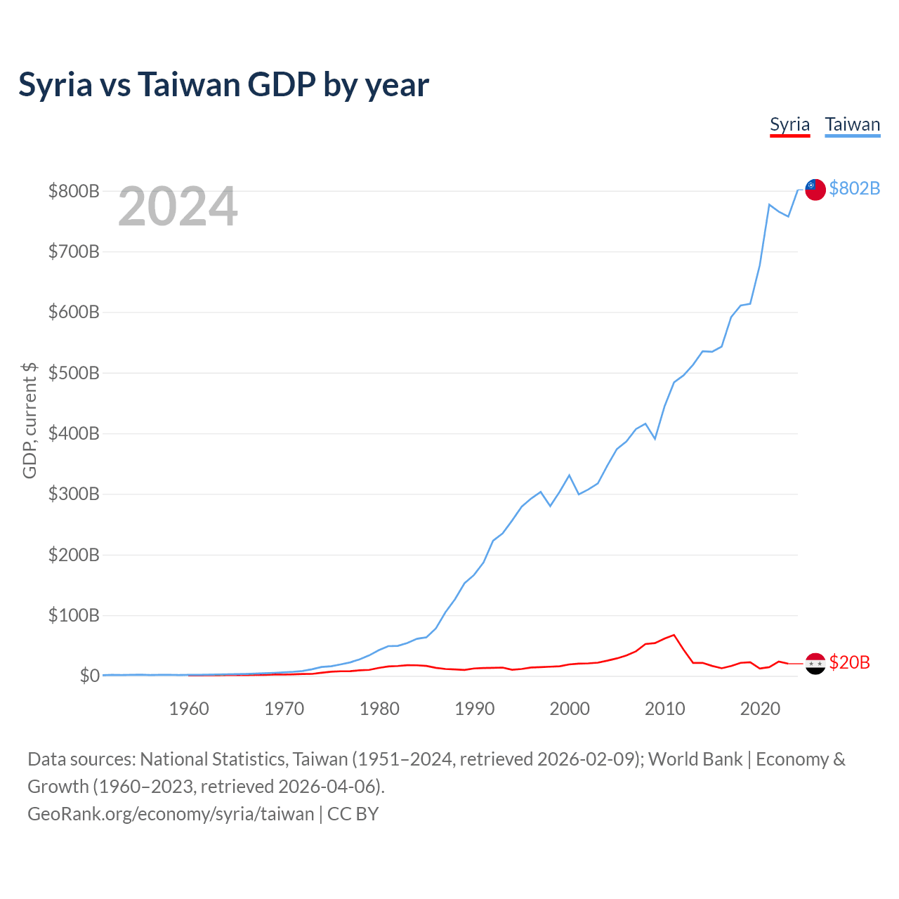 Syria has a GDP of $20B compared to $802B for Taiwan, ranking 129/197 and 22/197 by economy size, respectively.