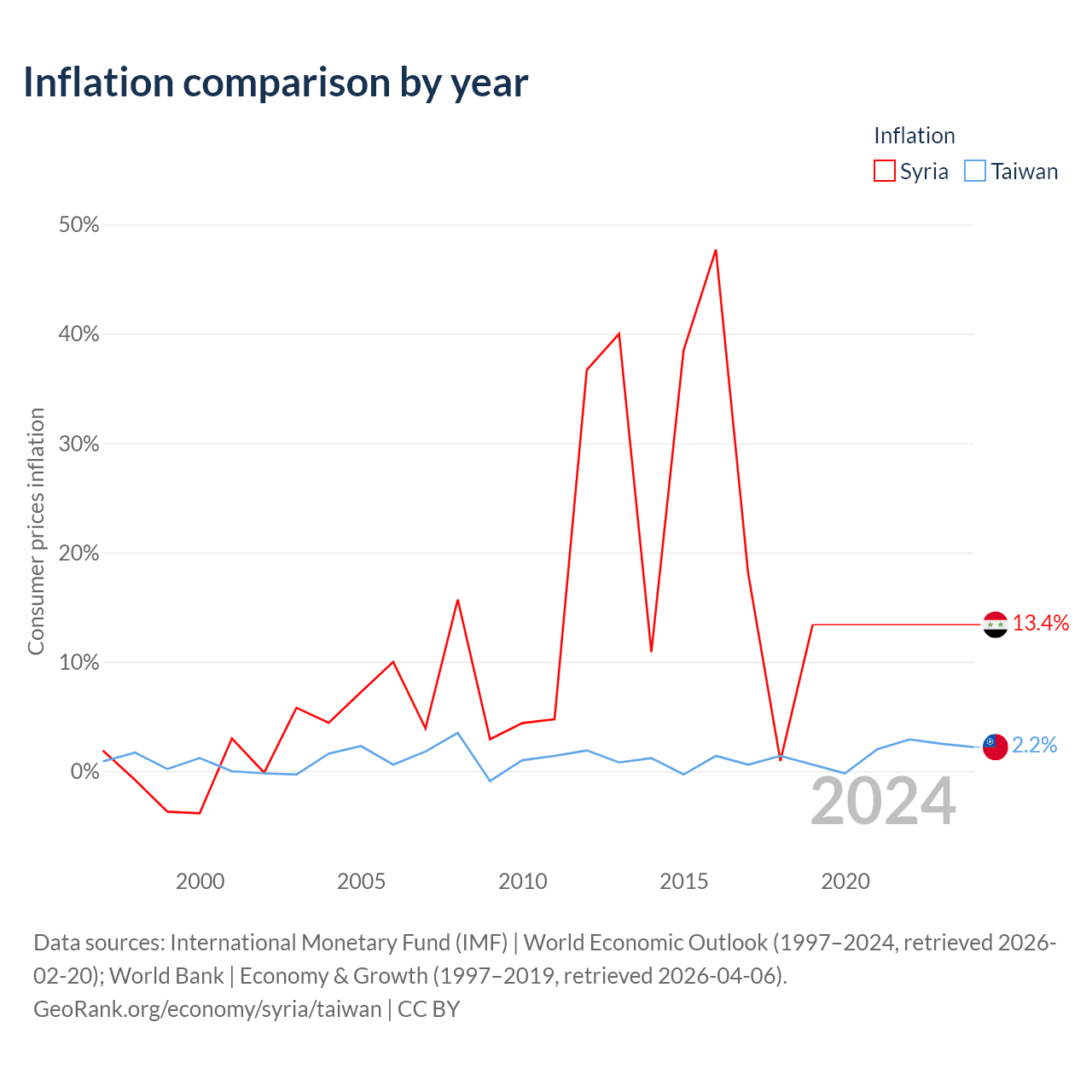 The Economic Freedom Index for Syria is 51.2, ranking 155/197, compared to 79.8 for Taiwan, ranking 6/197. The chart above displays a comparison of annual changes in economic freedom indexes.