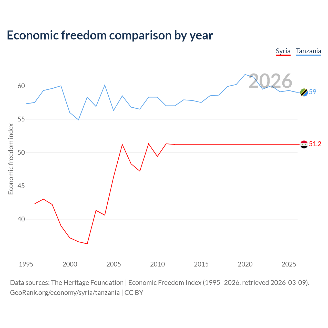 The Economic Freedom Index for Syria is 51.2, ranking 155/197, compared to 59 for Tanzania, ranking 106/197. The chart above displays a comparison of annual changes in economic freedom indexes.