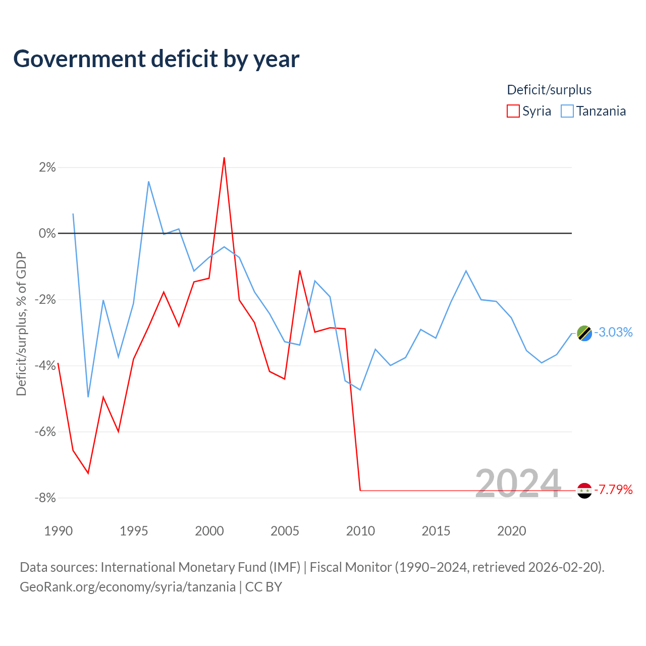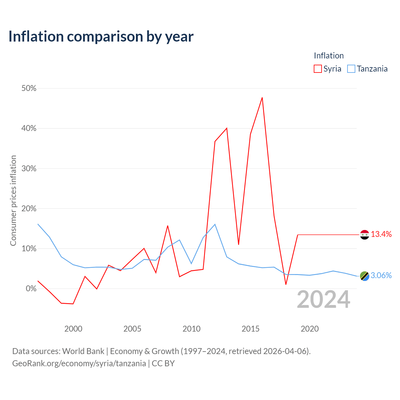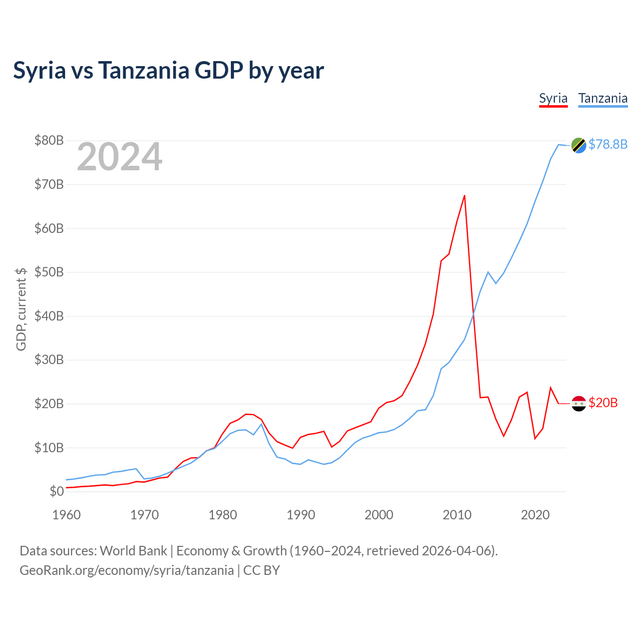 Syria has a GDP of $20B compared to $78.8B for Tanzania, ranking 129/197 and 82/197 by economy size, respectively.