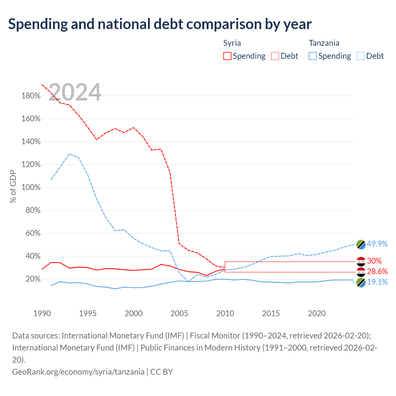 Syria has $18.4B in government debt (30% of GDP), compared to $39.3B (49.9% of GDP) in Tanzania.