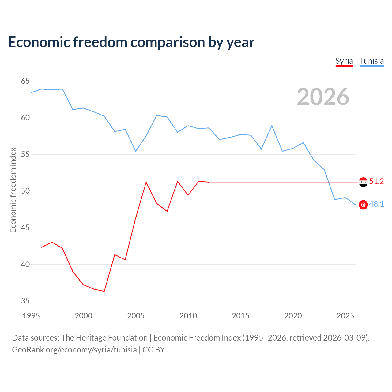 The Economic Freedom Index for Syria is 51.2, ranking 155/197, compared to 48.1 for Tunisia, ranking 172/197. The chart above displays a comparison of annual changes in economic freedom indexes.