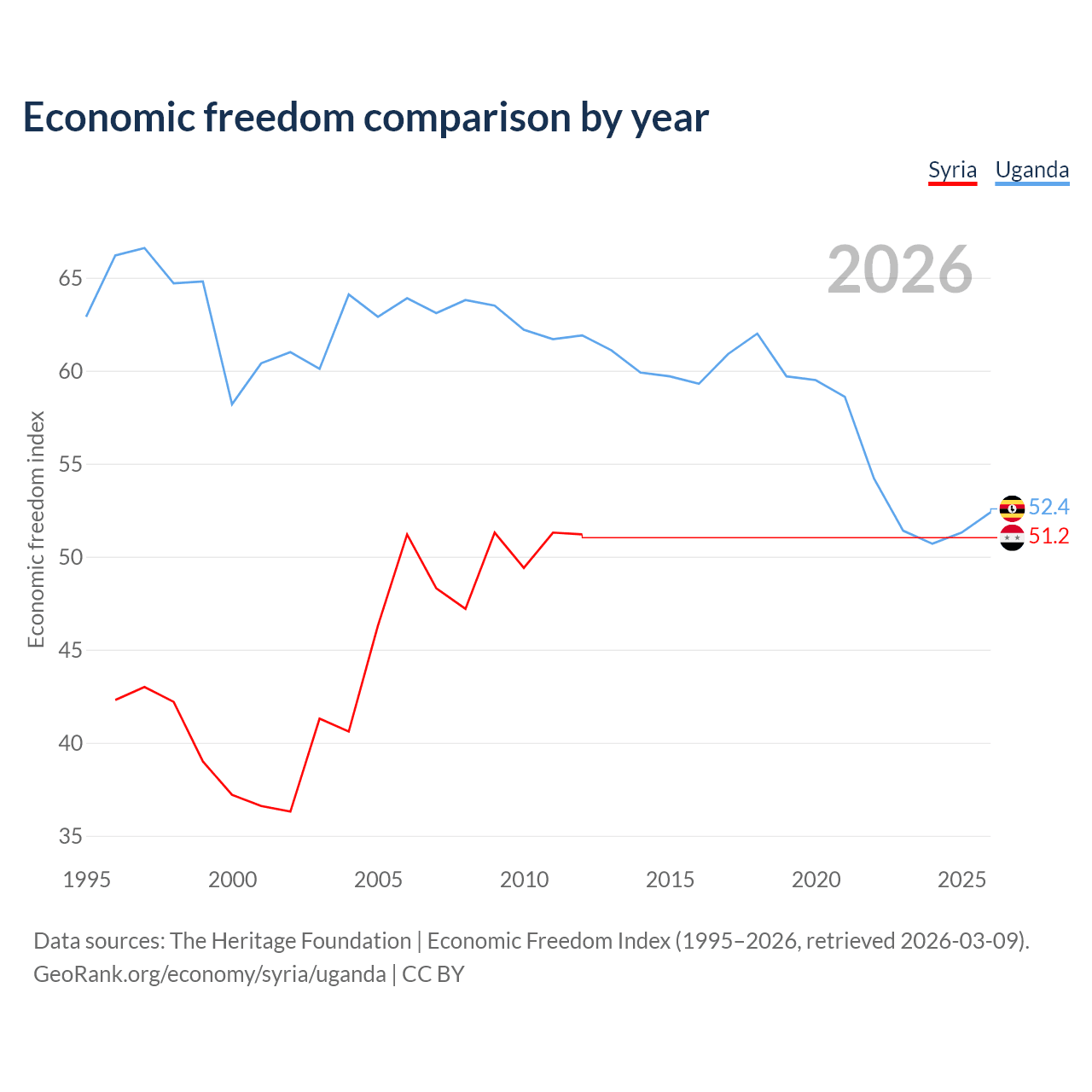 The Economic Freedom Index for Syria is 51.2, ranking 155/197, compared to 52.4 for Uganda, ranking 149/197. The chart above displays a comparison of annual changes in economic freedom indexes.