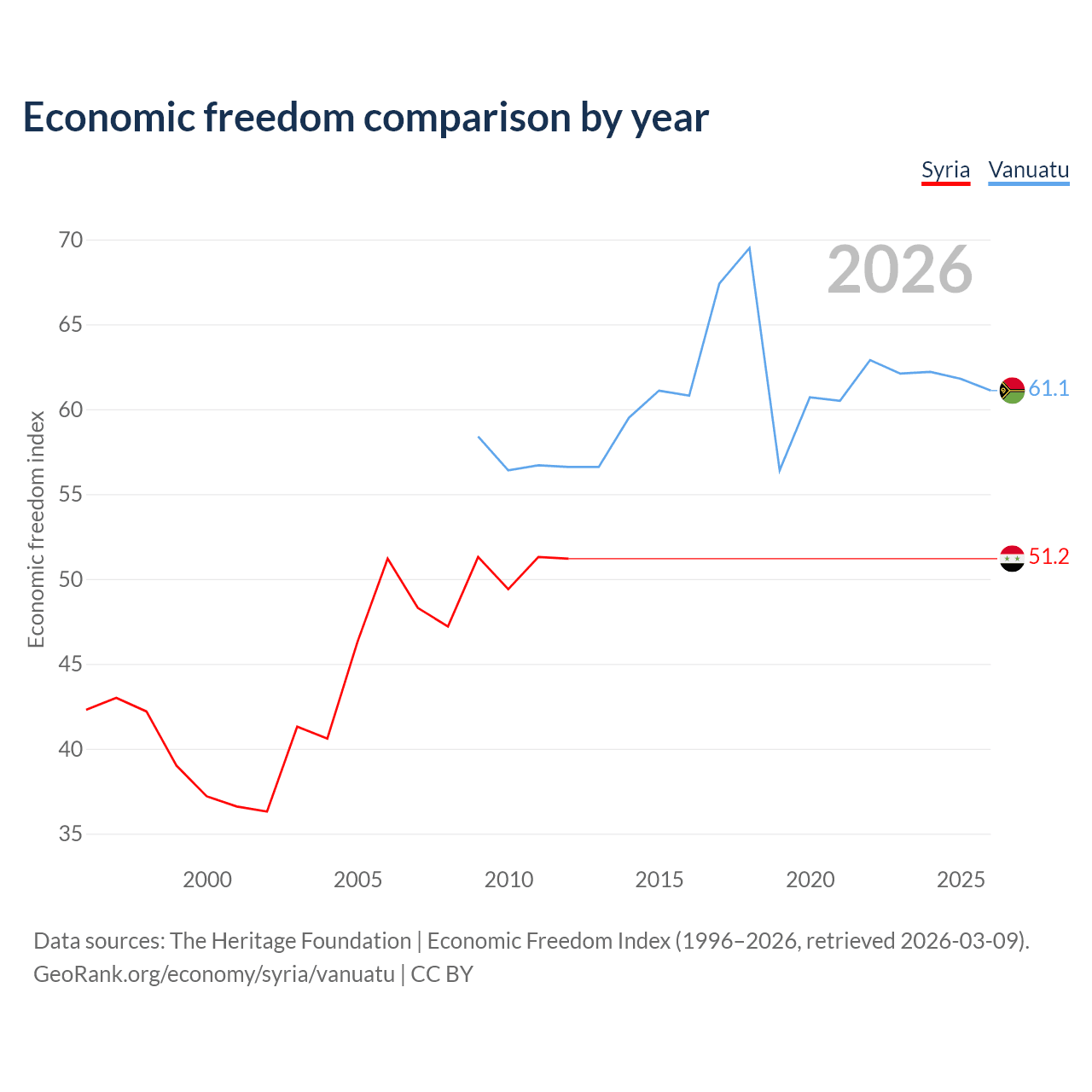 The Economic Freedom Index for Syria is 51.2, ranking 155/197, compared to 61.1 for Vanuatu, ranking 92/197. The chart above displays a comparison of annual changes in economic freedom indexes.