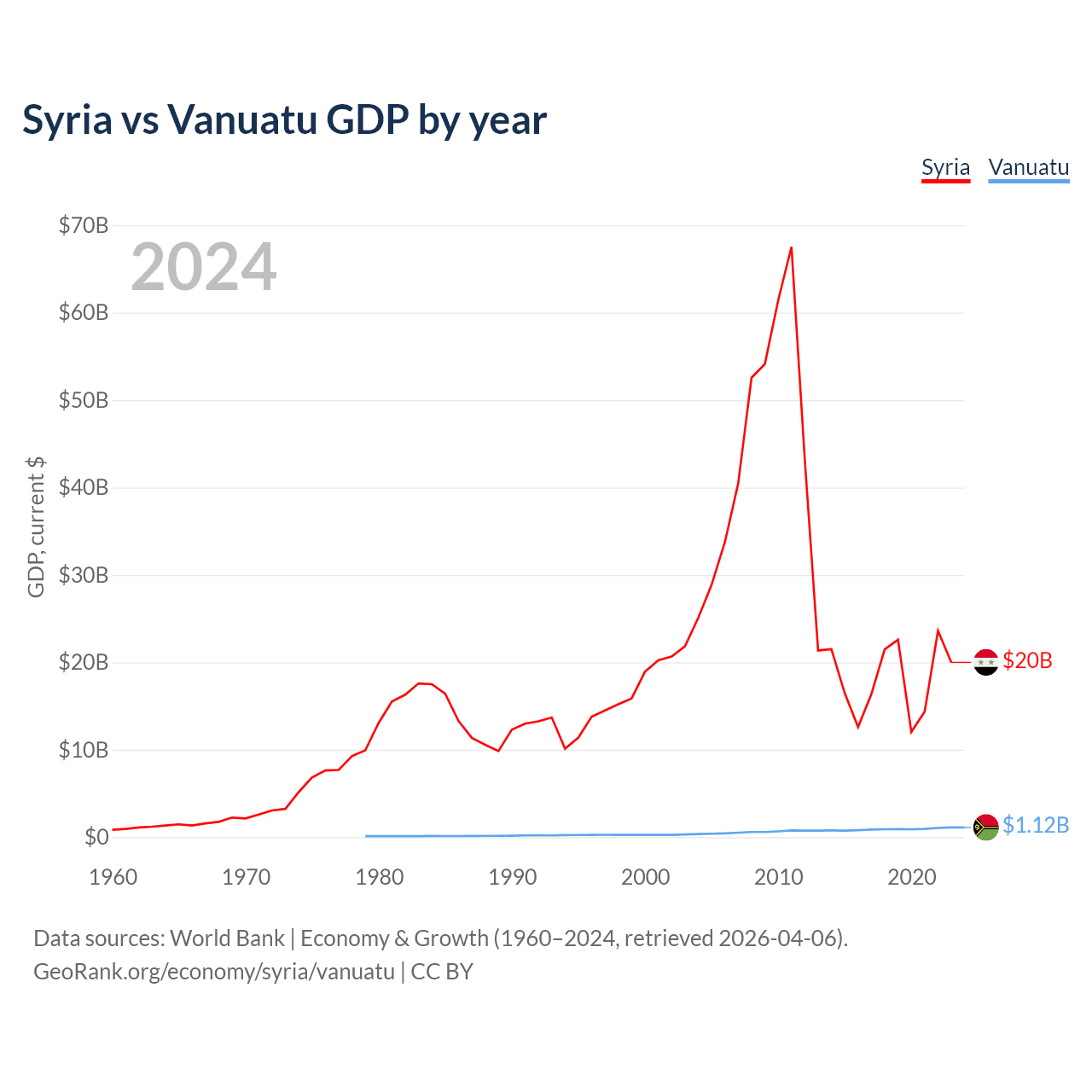 Syria has a GDP of $20B compared to $1.12B for Vanuatu, ranking 129/197 and 188/197 by economy size, respectively.