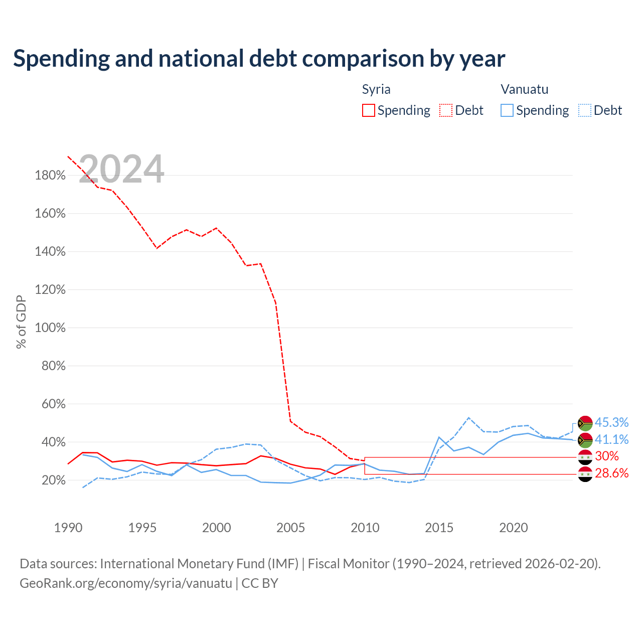 Syria has $18.4B in government debt (30% of GDP), compared to $507M (45.3% of GDP) in Vanuatu.