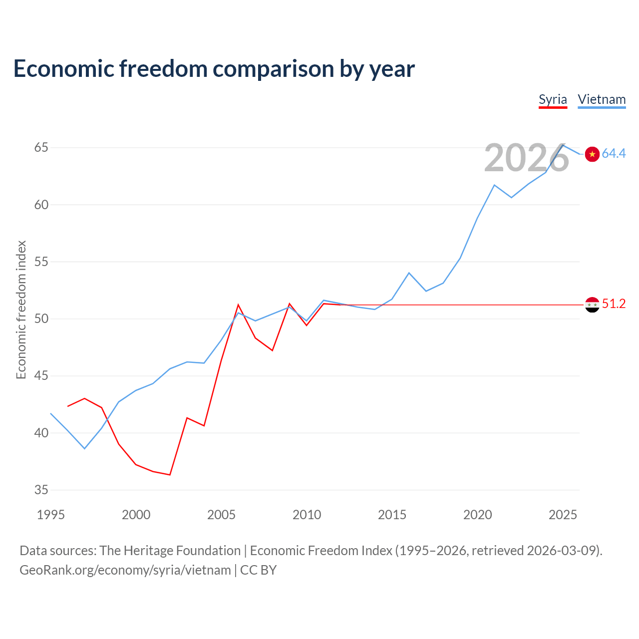 The Economic Freedom Index for Syria is 51.2, ranking 155/197, compared to 64.4 for Vietnam, ranking 73/197. The chart above displays a comparison of annual changes in economic freedom indexes.