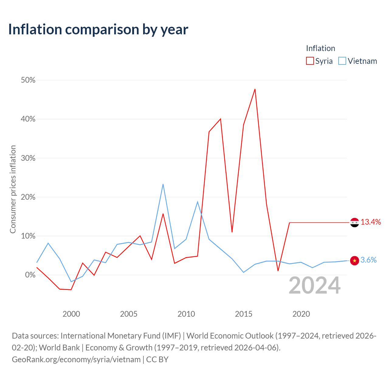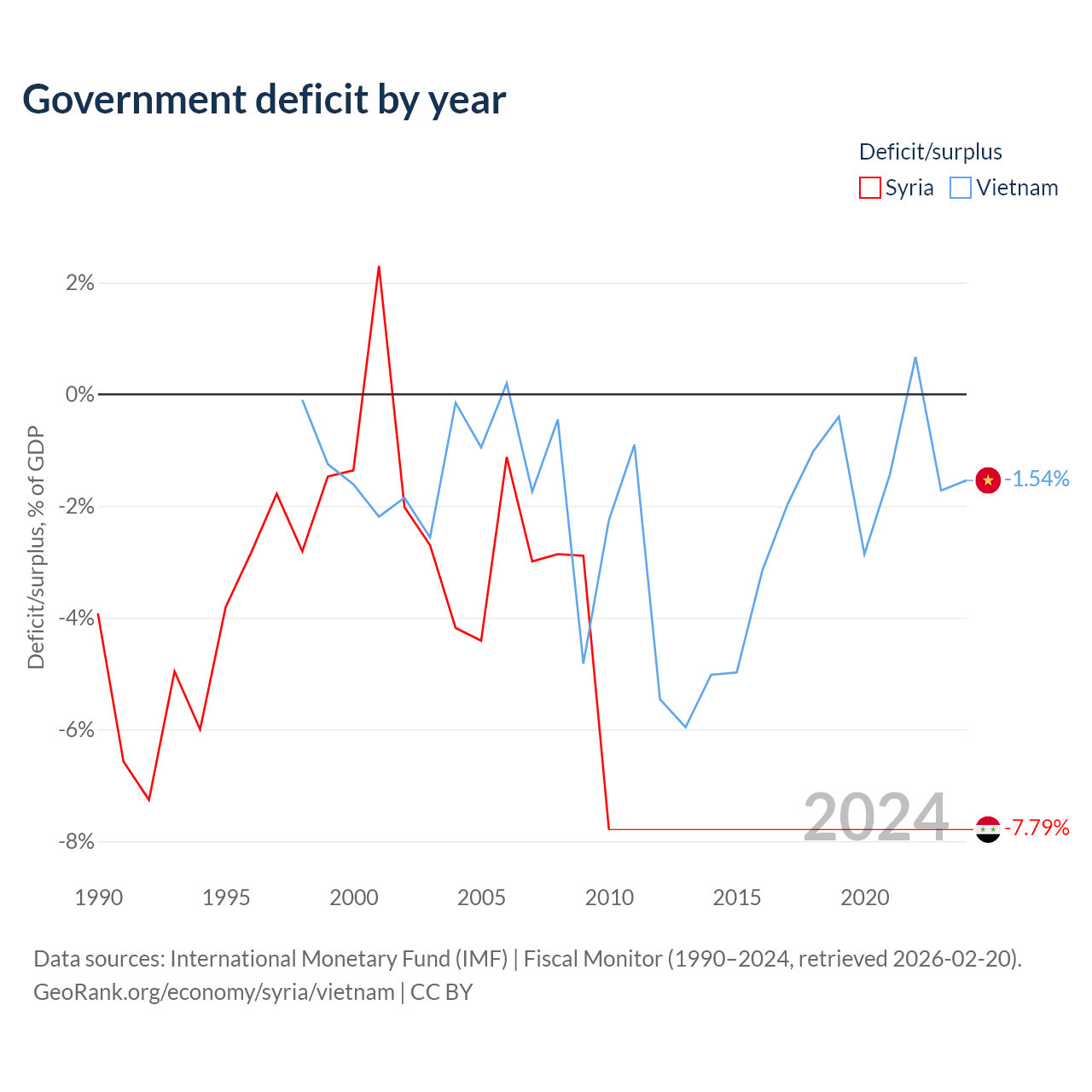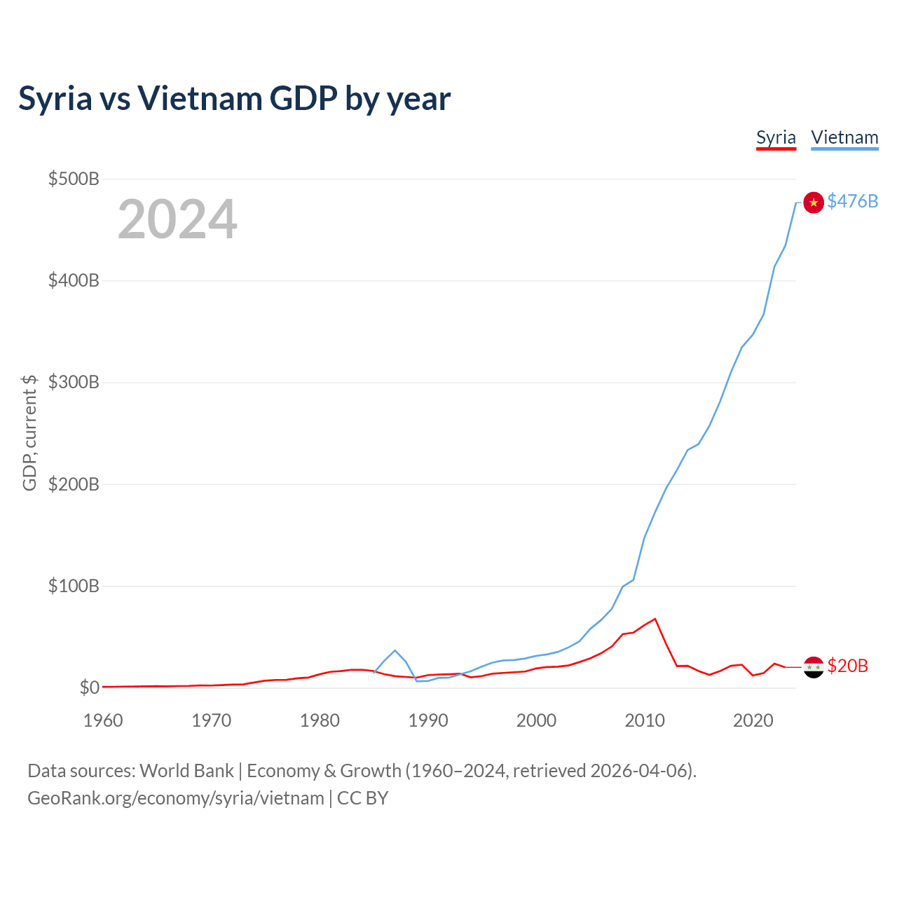 Syria has a GDP of $20B compared to $476B for Vietnam, ranking 129/197 and 33/197 by economy size, respectively.