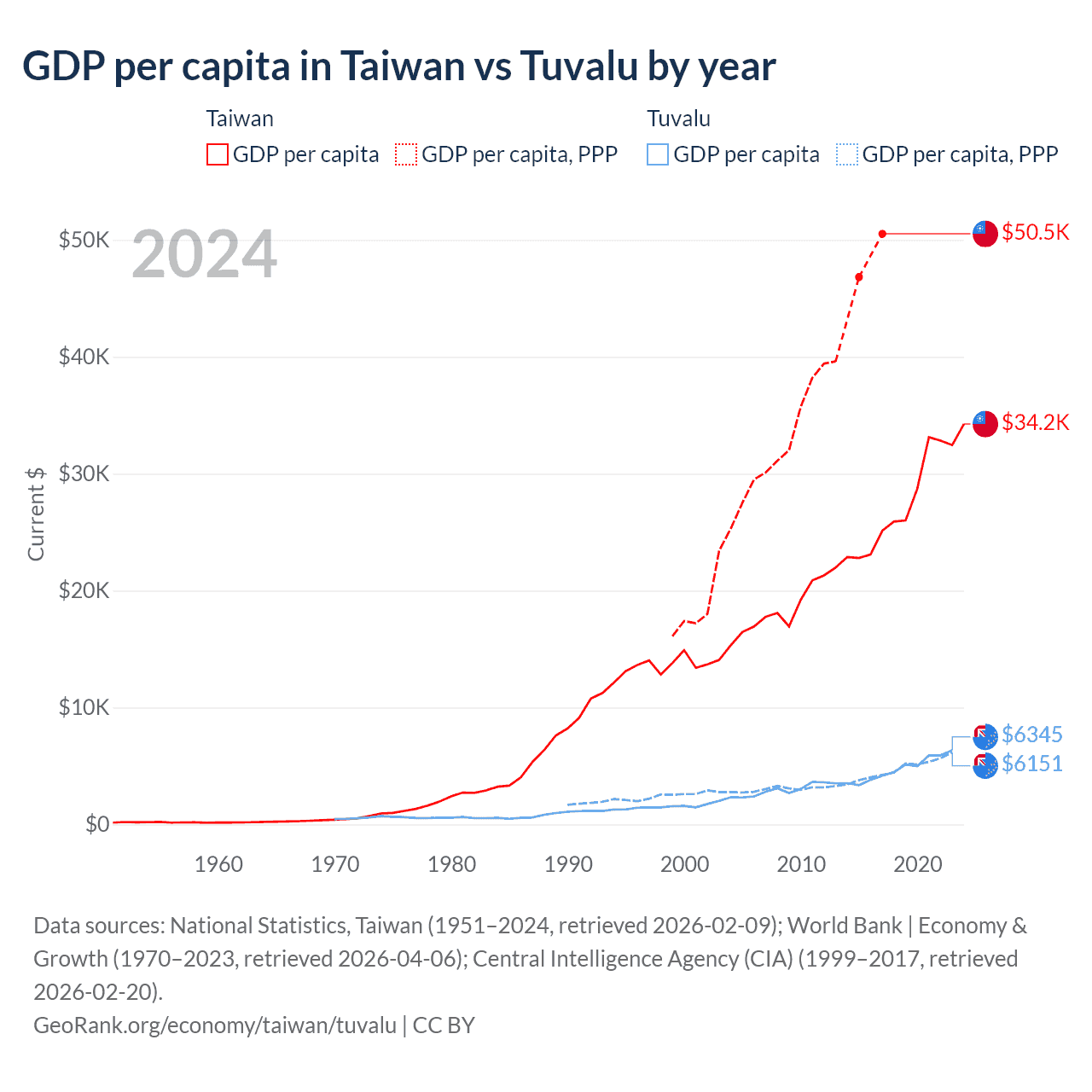 Data sources: National Statistics, Taiwan (1951–2024, retrieved 2026-02-09); World Bank | Economy & Growth (1970–2023, retrieved 2026-04-06).