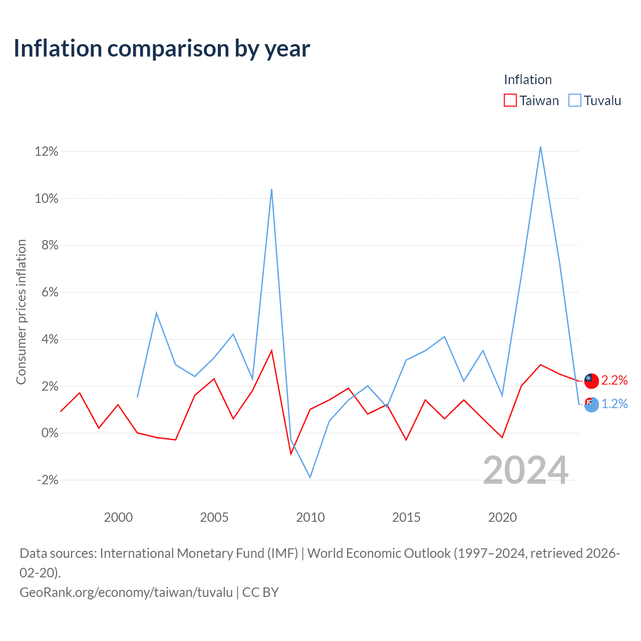 Over the past 24 years, Taiwan has recorded an average annual inflation rate of 1.16%, compared with 3.34% in Tuvalu. In 2024, inflation was 2.2% in Taiwan and 1.2% in Tuvalu.