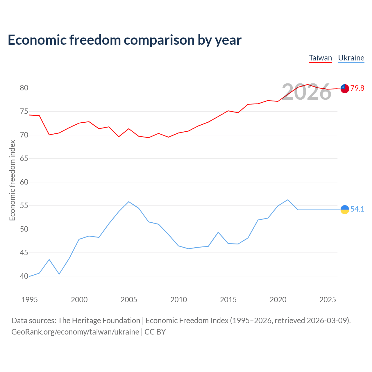 The Economic Freedom Index for Taiwan is 79.8, ranking 6/197, compared to 54.1 for Ukraine, ranking 135/197. The chart above displays a comparison of annual changes in economic freedom indexes.