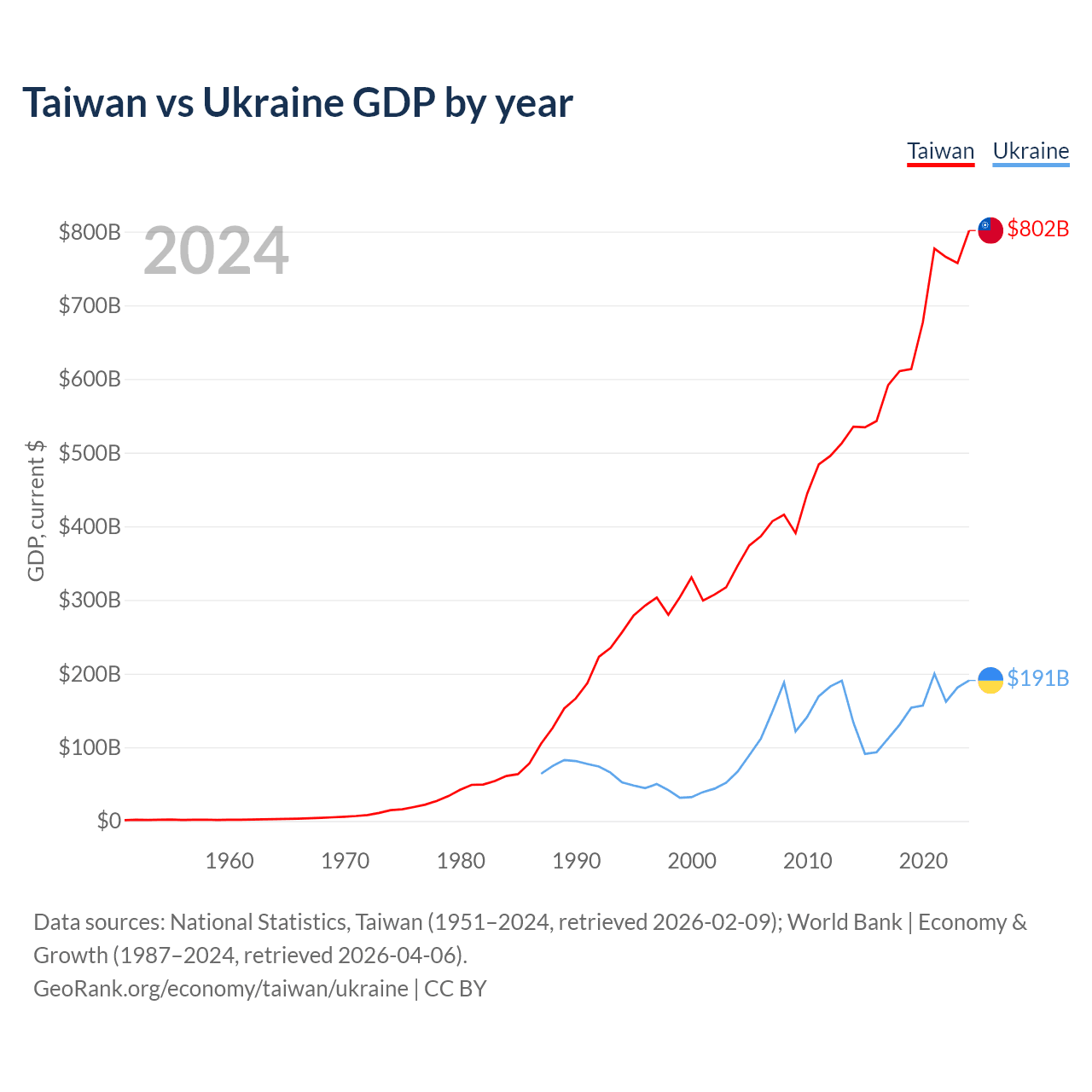 Taiwan has a GDP of $802B compared to $191B for Ukraine, ranking 22/197 and 57/197 by economy size, respectively.