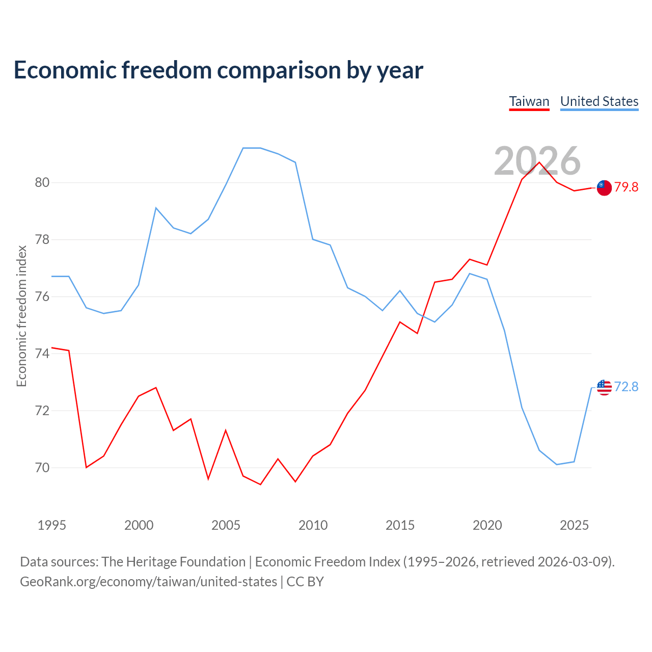 Data sources: The Heritage Foundation | Economic Freedom Index (1995–2026, retrieved 2026-03-09).