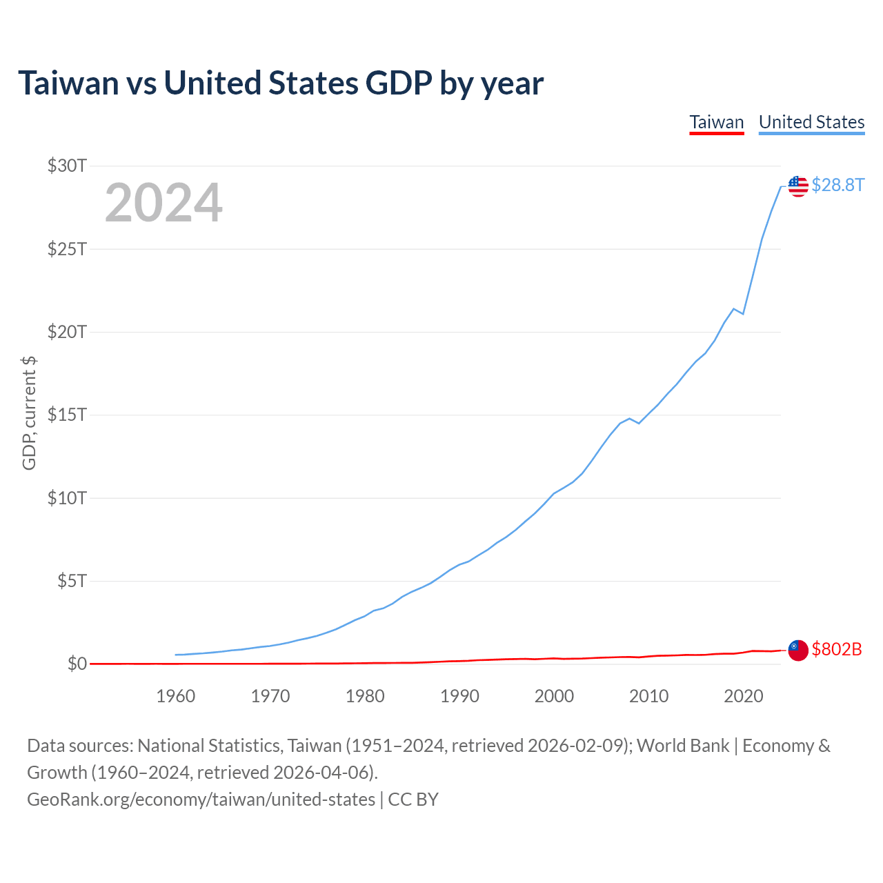 Taiwan has a GDP of $802B compared to $28.8T for the United States, ranking 22/197 and 1/197 by economy size, respectively.