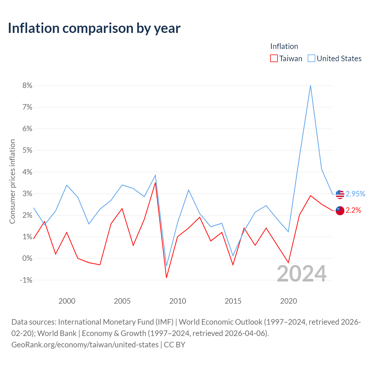 Data sources: World Bank | Economy & Growth (1985–2024, retrieved 2026-04-06); National Statistics, Taiwan (1985–2024, retrieved 2026-02-09); U.S. Census Bureau (1985–2024, retrieved 2026-02-08).