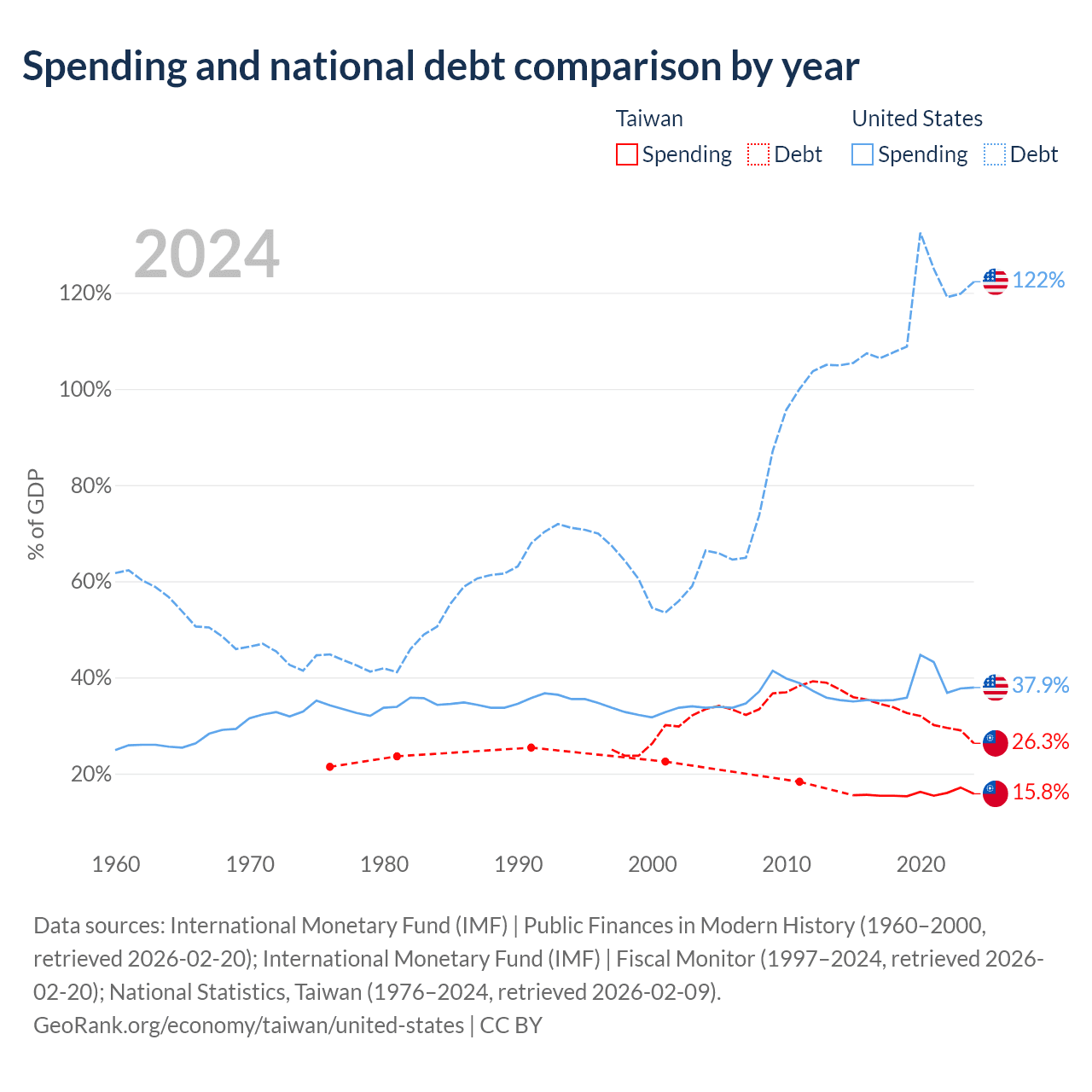 Taiwan has $211B in government debt (26.3% of GDP), compared to $35.2T (122.3% of GDP) in the United States.