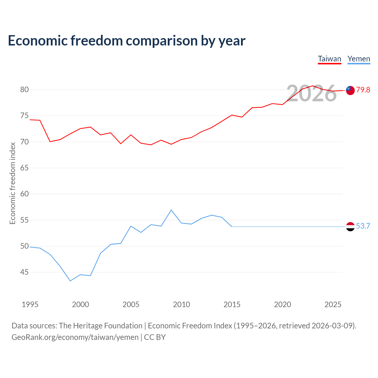The Economic Freedom Index for Taiwan is 79.8, ranking 6/197, compared to 53.7 for Yemen, ranking 138/197. The chart above displays a comparison of annual changes in economic freedom indexes.