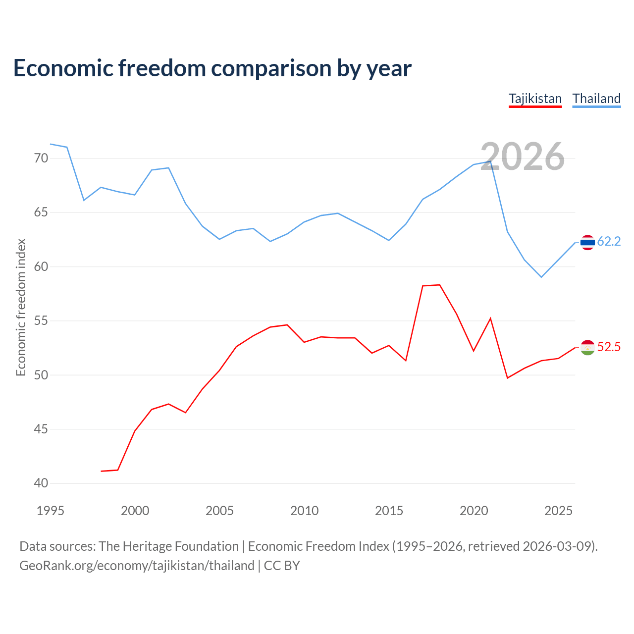The Economic Freedom Index for Tajikistan is 52.5, ranking 147/197, compared to 62.2 for Thailand, ranking 88/197. The chart above displays a comparison of annual changes in economic freedom indexes.