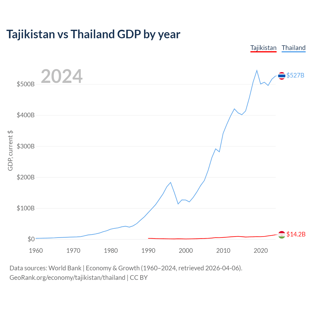 Tajikistan has a GDP of $14.2B compared to $527B for Thailand, ranking 145/197 and 31/197 by economy size, respectively.
