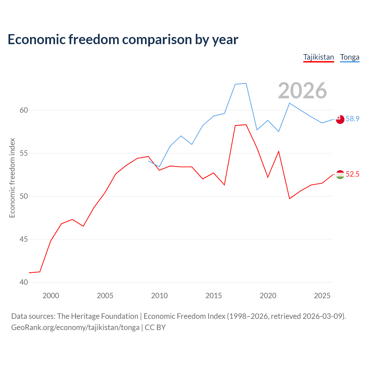 The Economic Freedom Index for Tajikistan is 52.5, ranking 147/197, compared to 58.9 for Tonga, ranking 107/197. The chart above displays a comparison of annual changes in economic freedom indexes.