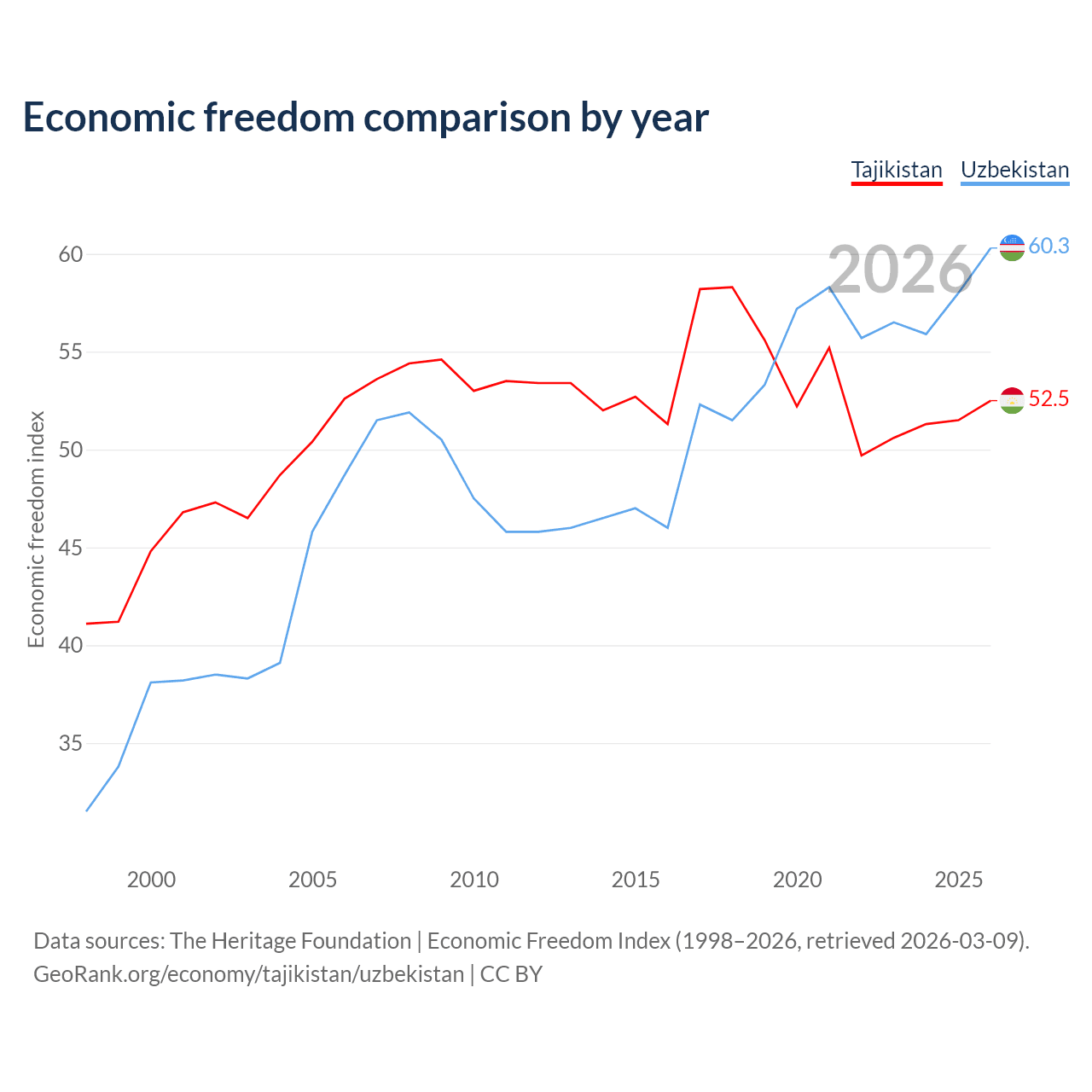The Economic Freedom Index for Tajikistan is 52.5, ranking 147/197, compared to 60.3 for Uzbekistan, ranking 94/197. The chart above displays a comparison of annual changes in economic freedom indexes.