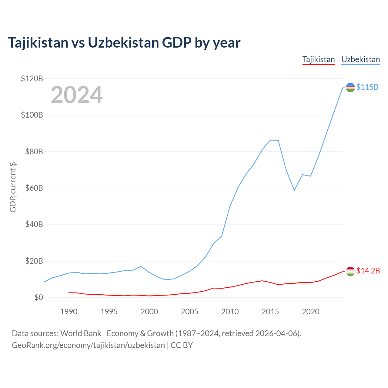 Tajikistan has a GDP of $14.2B compared to $115B for Uzbekistan, ranking 145/197 and 66/197 by economy size, respectively.