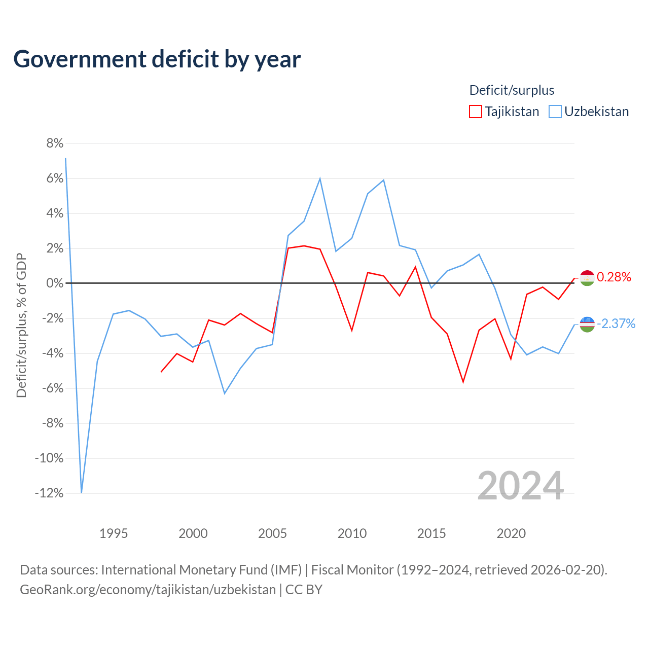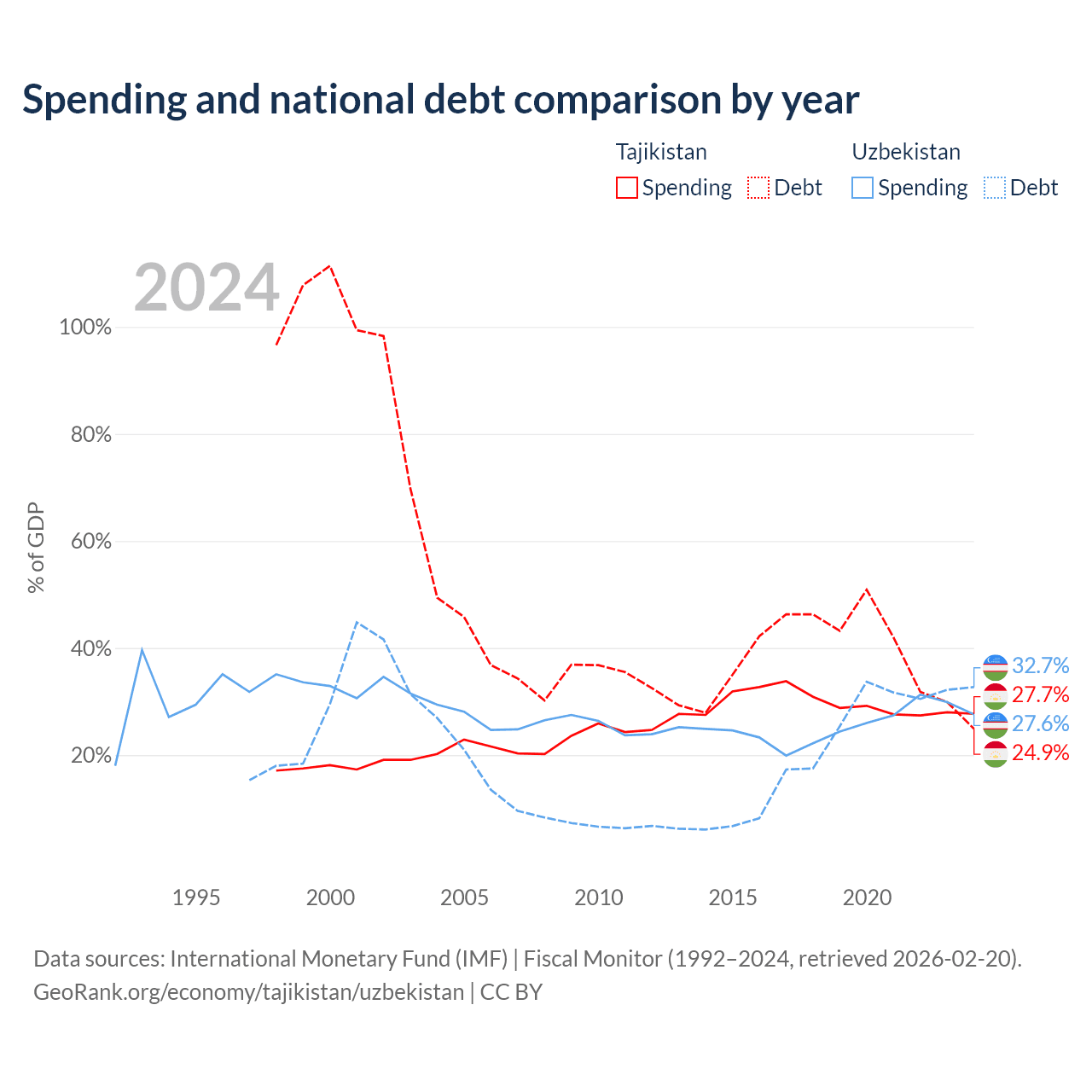 Tajikistan has $3.54B in government debt (24.9% of GDP), compared to $37.5B (32.7% of GDP) in Uzbekistan.
