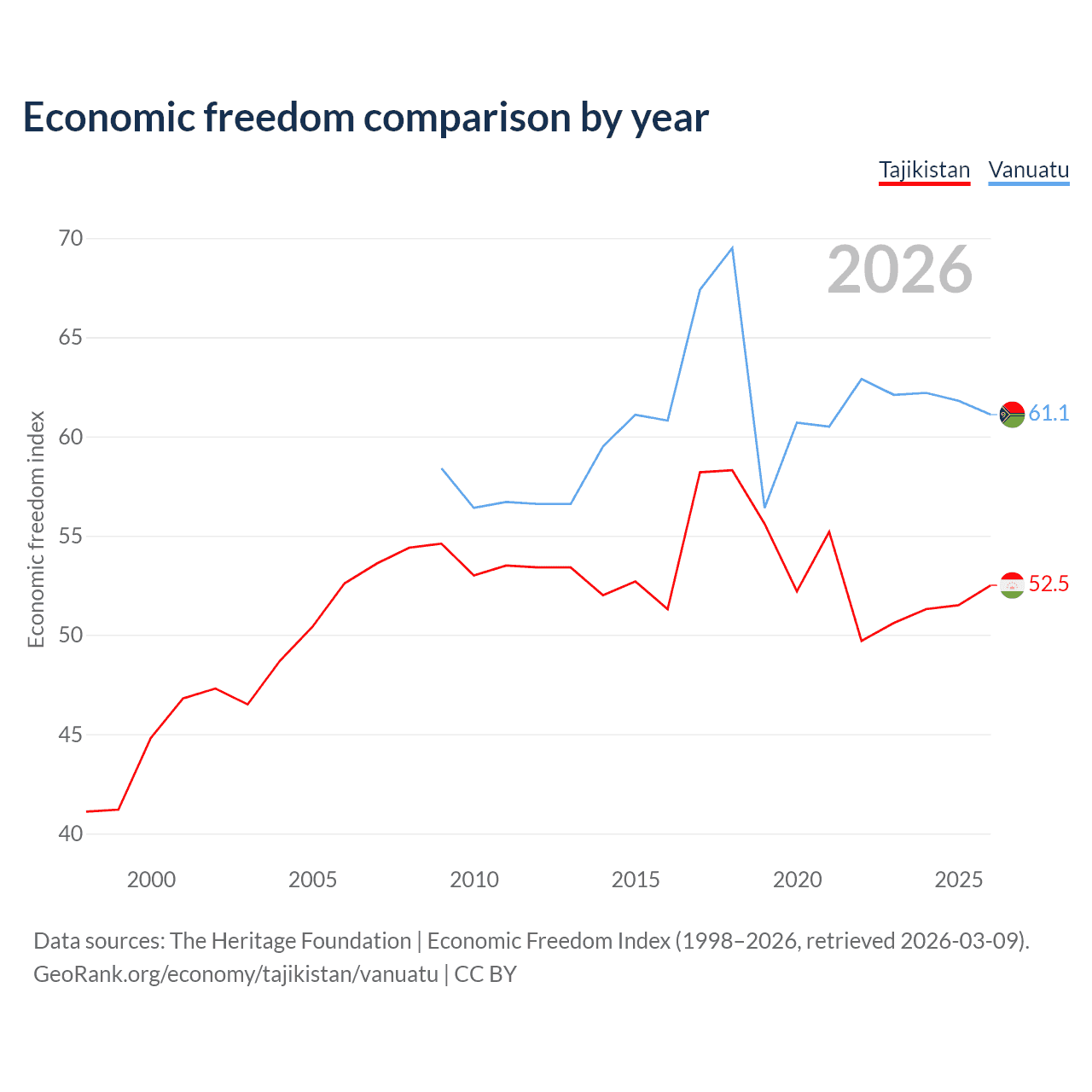 The Economic Freedom Index for Tajikistan is 52.5, ranking 147/197, compared to 61.1 for Vanuatu, ranking 92/197. The chart above displays a comparison of annual changes in economic freedom indexes.